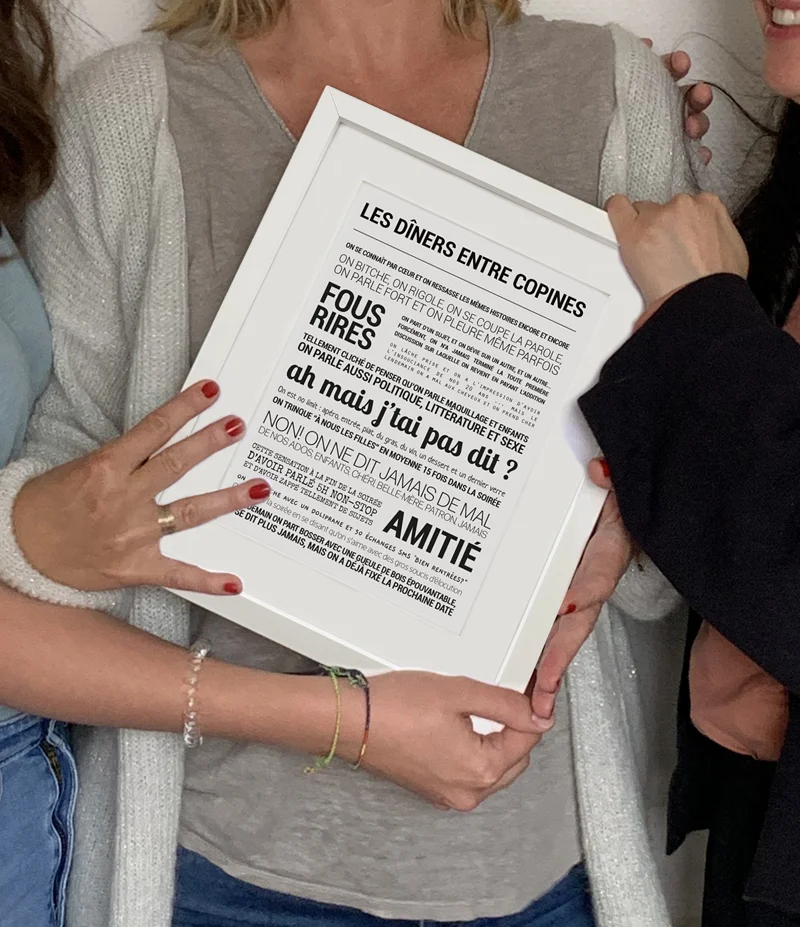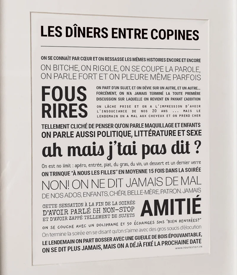 Diners entres copines – TOUT EST DIT Une affiche qui dit tout haut ce qu’on vit tous les jours (et qu’on n’ose pas toujours dire). Drôle, touchante, vraie : à offrir ou à s’offrir. Vendu dans son cadre noir en bois. Dimensions de l’affiche : 30 x 40 cm. Fabrication française.