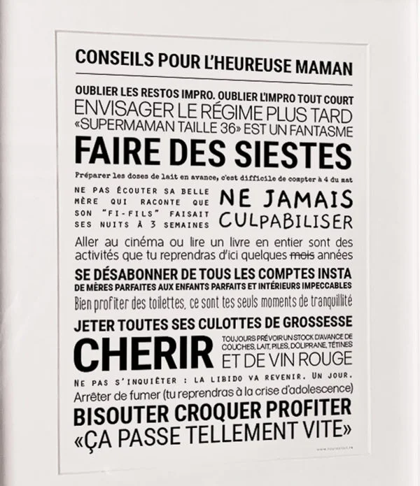 Heureuse Maman – TOUT EST DIT Une affiche qui dit tout haut ce qu’on vit tous les jours (et qu’on n’ose pas toujours dire). Drôle, touchante, vraie : à offrir ou à s’offrir. Vendu dans son cadre noir en bois. Dimensions de l’affiche : 30 x 40 cm. Fabrication française.