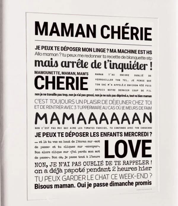 Affiche Maman Chérie – TOUT EST DIT Une affiche qui dit tout haut ce qu’on vit tous les jours (et qu’on n’ose pas toujours dire). Drôle, touchante, vraie : à offrir ou à s’offrir. Vendu dans son cadre noir en bois. Dimensions de l’affiche : 30 x 40 cm. Fabrication française.