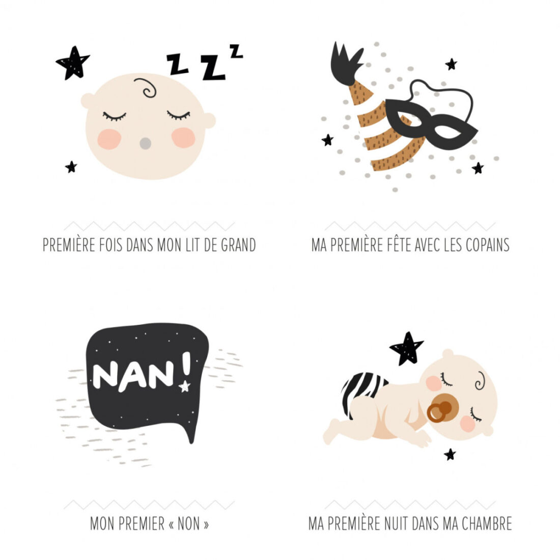 Souvenez-vous des petits moments qui comptent avec cette affiche des premières fois de bébé et son tampon dateur. L’univers graphique doux, poétique et chaleureux convient autant aux chambres des garçons qu’à celles de petites filles. Idéal pour un cadeau de naissance !