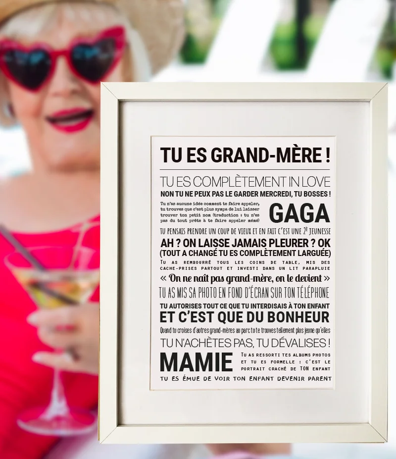 Affiche Tu es Grand Mère – TOUT EST DIT Une affiche qui dit tout haut ce qu’on vit tous les jours (et qu’on n’ose pas toujours dire). Drôle, touchante, vraie : à offrir ou à s’offrir. Vendu dans son cadre noir en bois. Dimensions de l’affiche : 30 x 40 cm. Fabrication française.