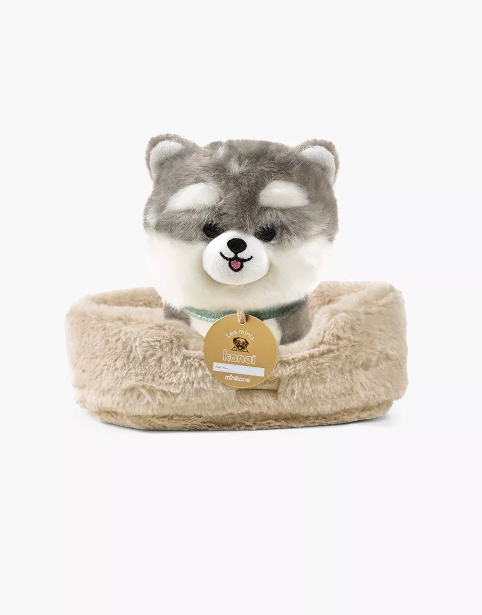 Aïko, chien en peluche de 18cm avec collier et son panier en fausse fourrure beige