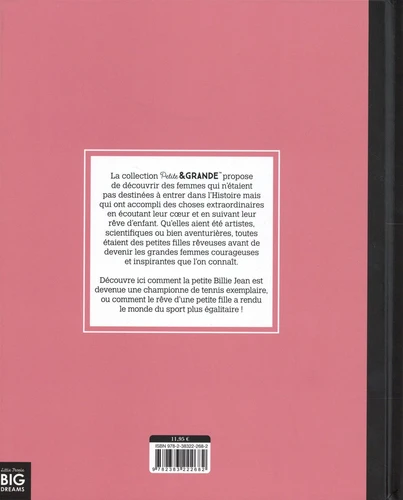 Livre pour enfants Petit & GRAND : Billie Jean King, qui raconte son parcours de championne de tennis et son combat pour l’égalité, avec des mots simples et des illustrations adaptées.