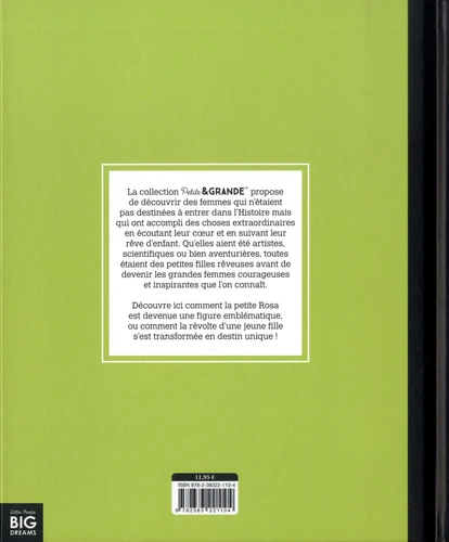 Album jeunesse de la collection Petite & GRANDE racontant comment la petite Rosa est devenue une figure emblématique de l’Histoire. Une histoire inspirante sur le courage, la révolte et la force de croire en ses rêves d’enfants,