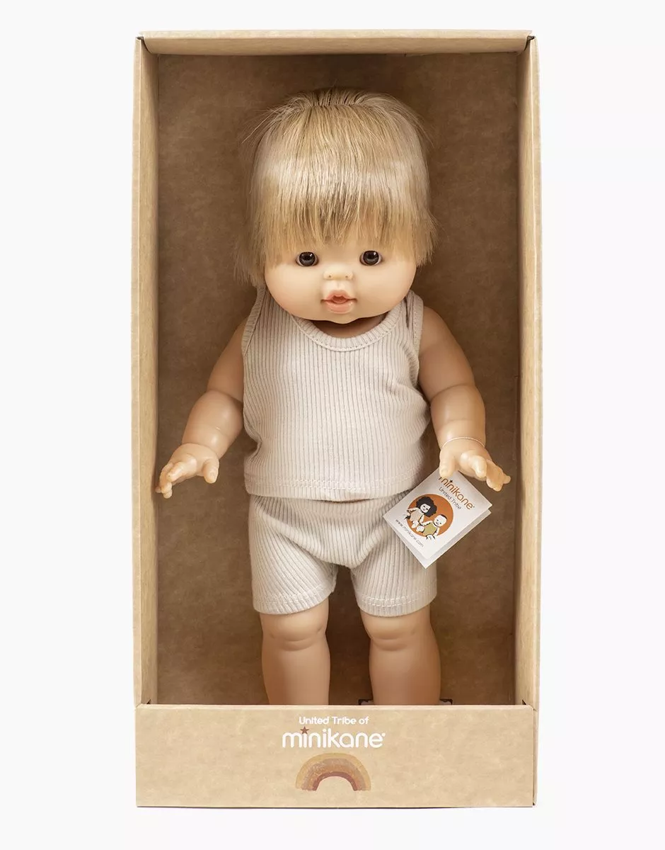 Archie, poupée exclusive Minikane® vendu dans son packaging – 37cm – Yeux marrons – Habillée en dessous Marcel (maille côtelée lin) – Se tient debout Poupée en vinyle et parfumée à la vanille.