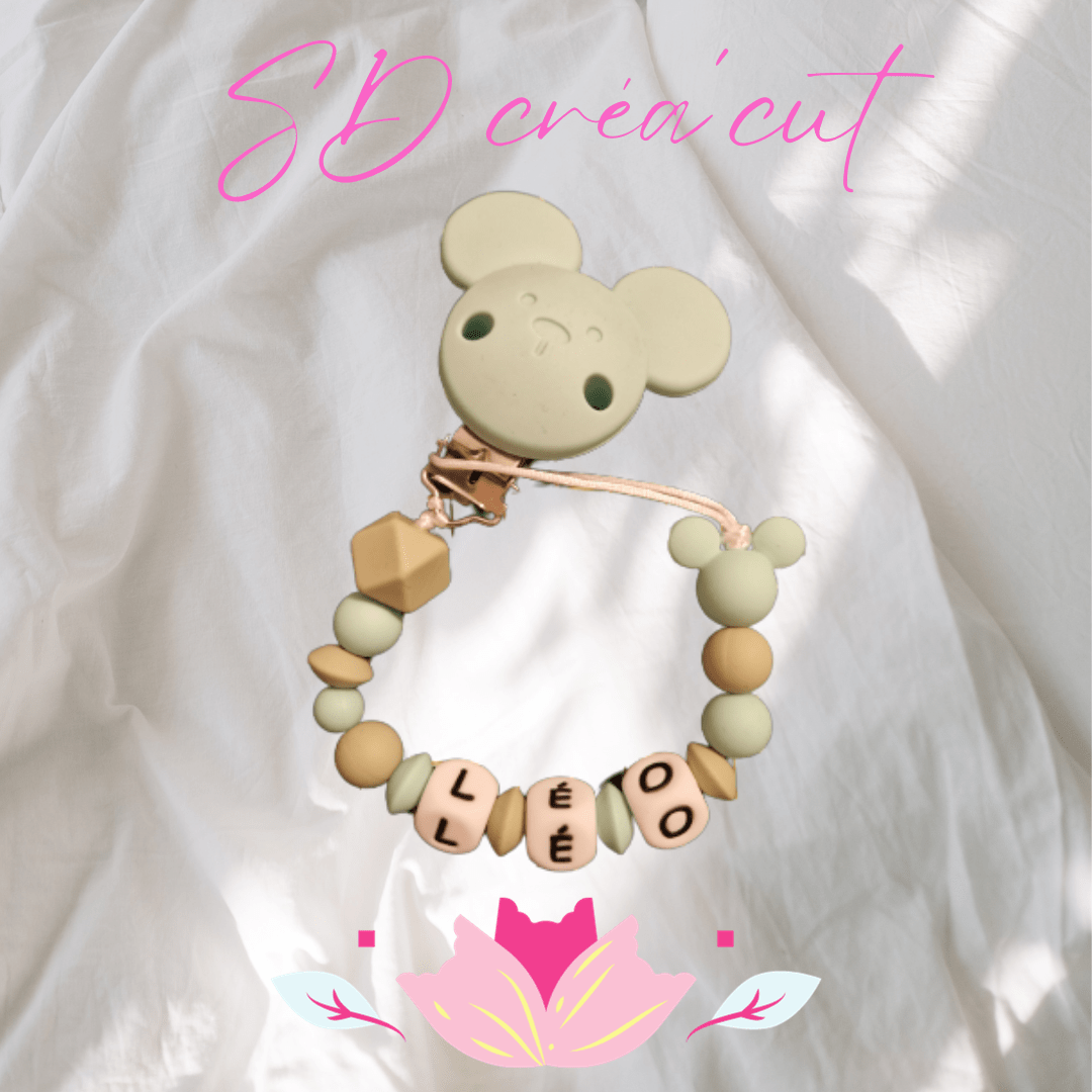 Attache-tétine en silicone Mickey Kaki et Vert d’eau | Sécurisée & Personnalisable