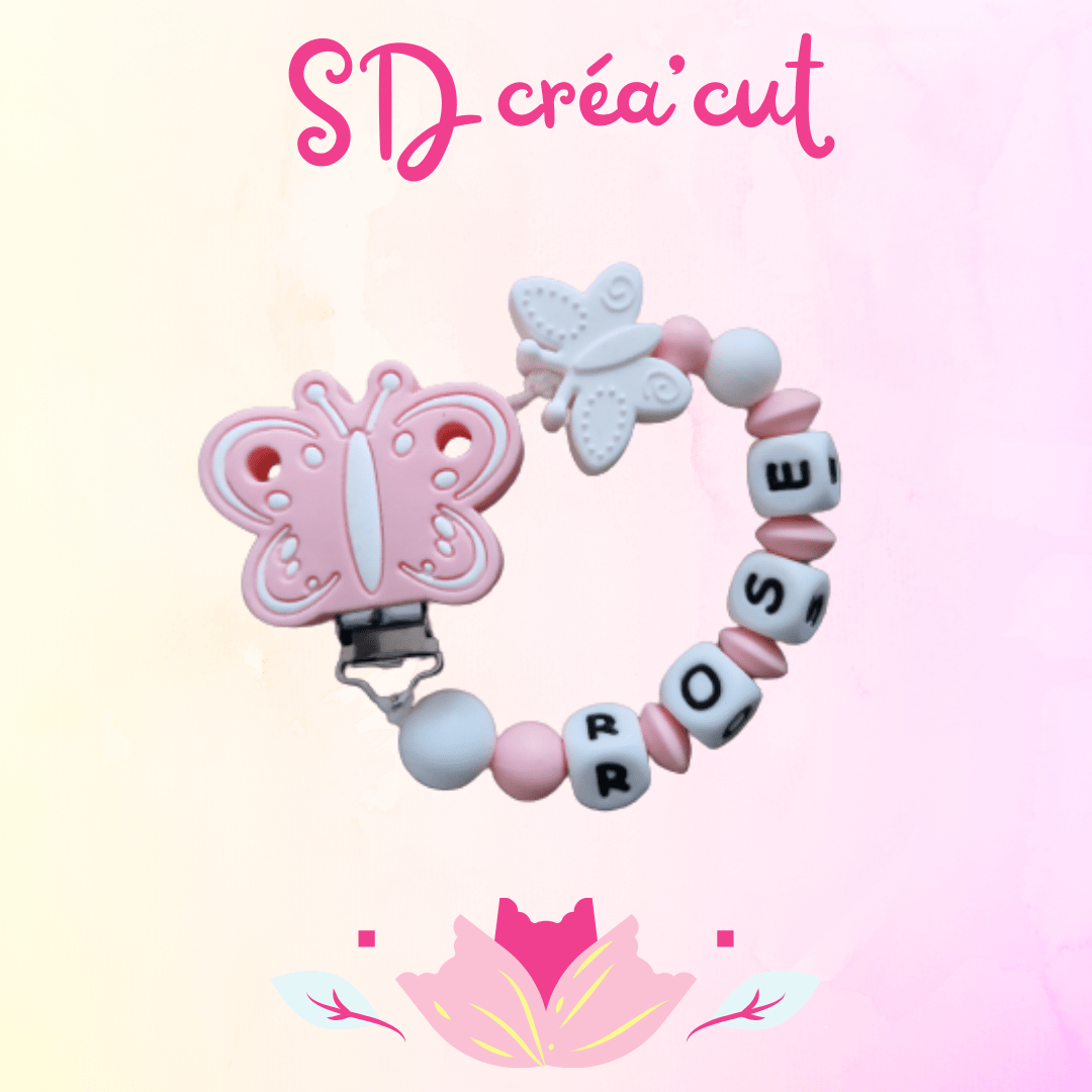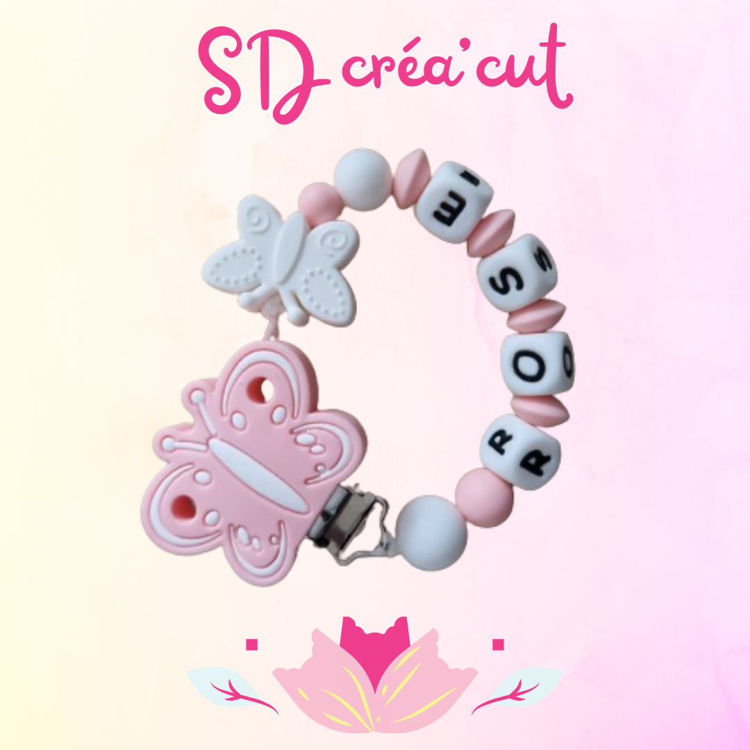 Attache-tétine en silicone Papillon Rose et Blanc | Personnalisable & Sécurisée