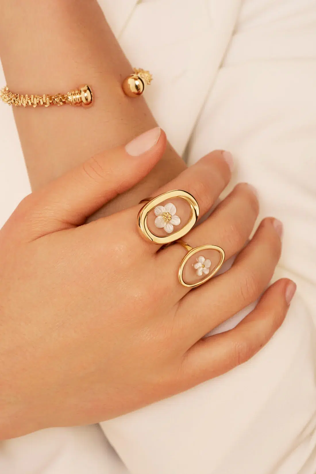 - Bague ovale en plaqué or, résine et fleur en nacre taillée à la main