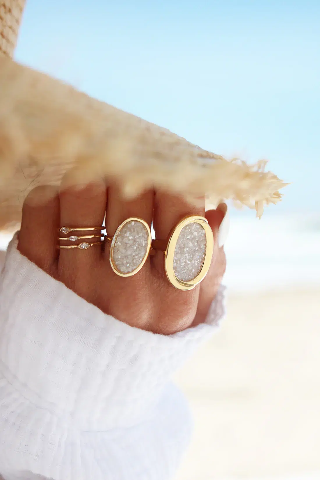• Bague en plaqué or, incrustation de nacre blanche • Mesure environ 2,5 cm x 1,5 cm • Bague made in France imaginée et réalisée artisanalement dans notre atelier parisien.