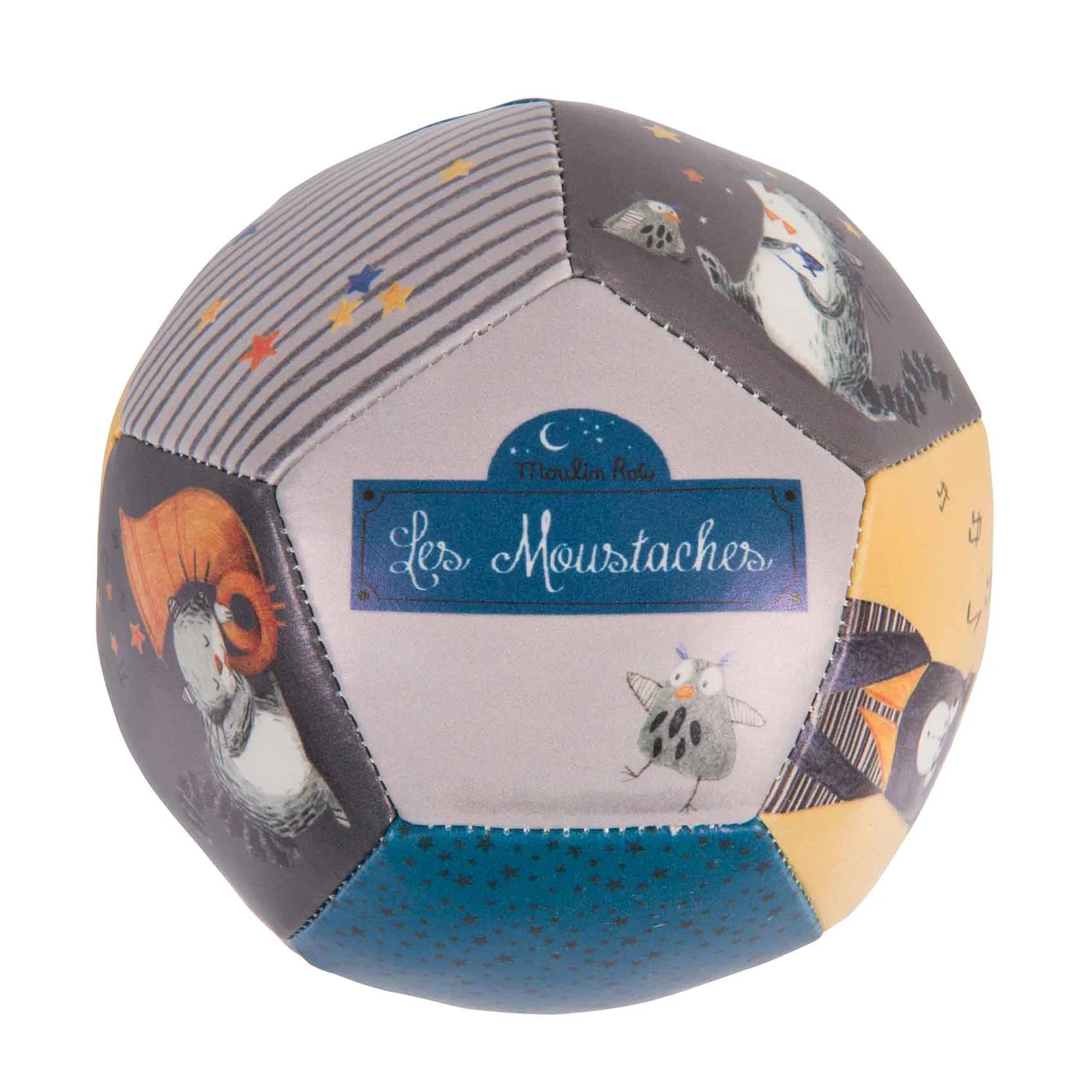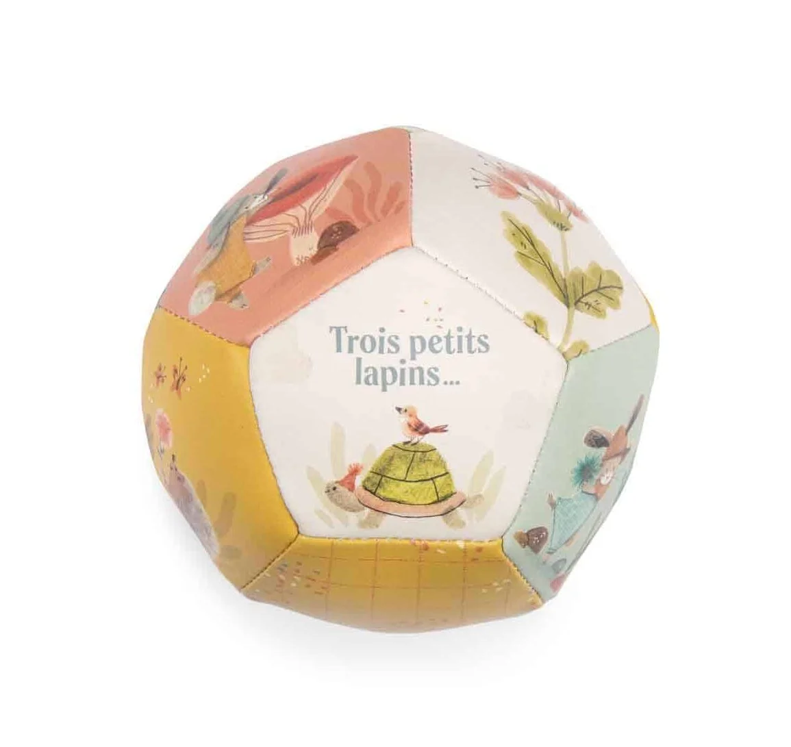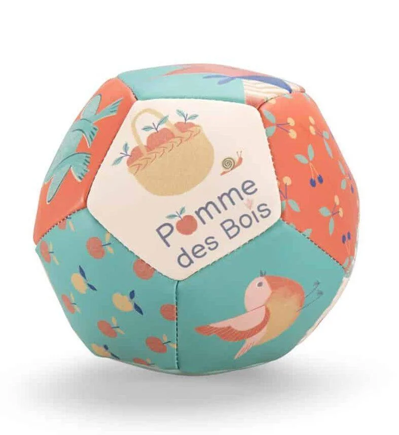 Ballon souple, Moulin Roty . Balle toute légère de 10cm de diamètre pour les premiers apprentissages de jeux des petits . Existe en de nombreuses déclinaisons .