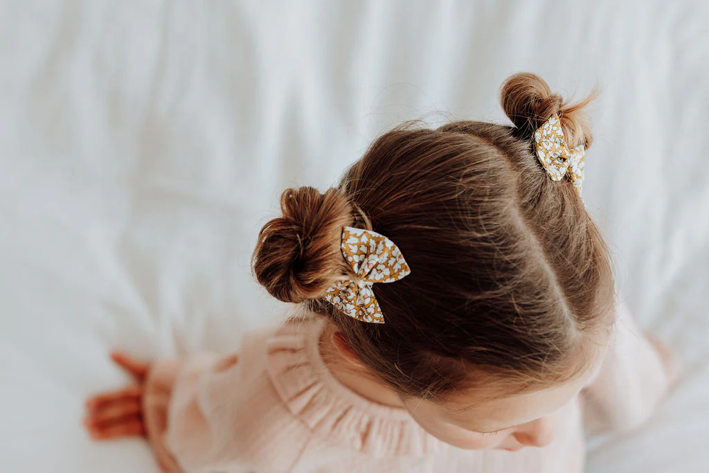 Ajoutez une touche de fantaisie à la coiffure de votre petite fille avec ce charmant nœud papillon en tissu Liberty of London Feather Meadow !