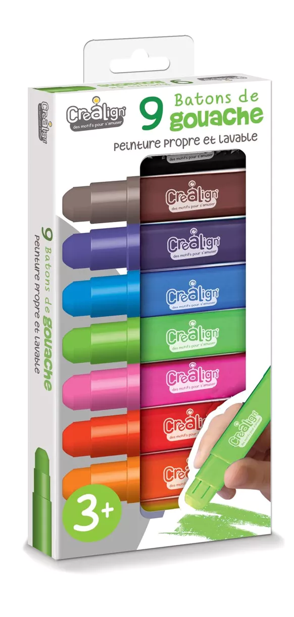 Un pack contenant 9 crayons gras avec effet gouache. L’encre sèche rapidement. Elle est ultra lavable sur la peau. Idéal pour stimuler l’imaginaire et les activités créatives des jeunes enfants. Les bâtons de gouache sont à pointes rétractables. Ils marquent forts et glissent bien. Les couleurs sont vives et plus couvrantes que des crayons de cire. La prise en main est facile et agréable.