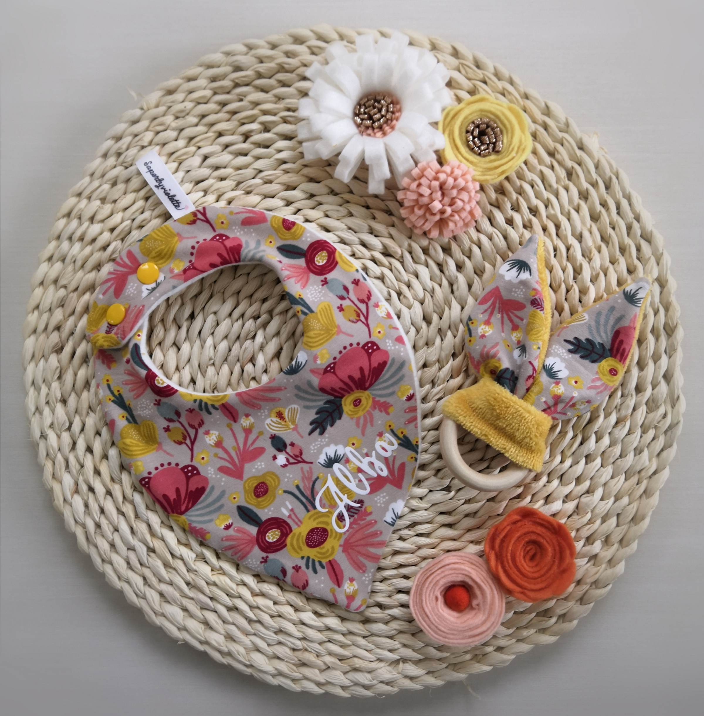 Possibilité de personnalisation de votre bavoir bandana fille au prénom de votre bébé (au flex thermocollant oeko-tex), en option.