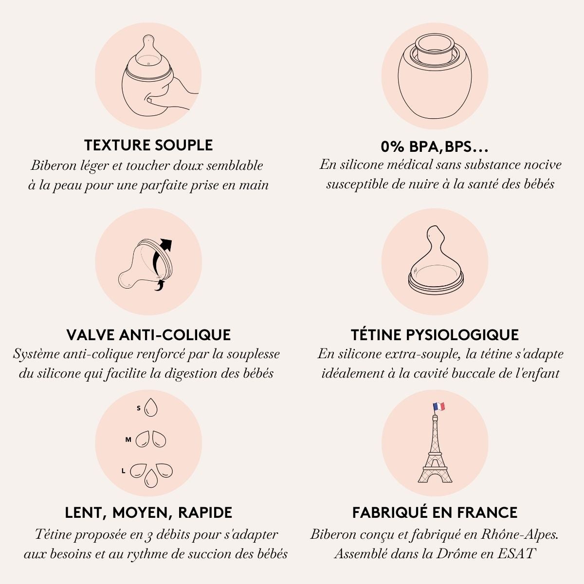 - Matériaux de Qualité : Fabriqués en silicone médical souple, les biberons Graou sont exempts de BPA, BPS, phtalates et autres perturbateurs endocriniens. Assurant ainsi la sécurité et le bien-être de votre enfant.