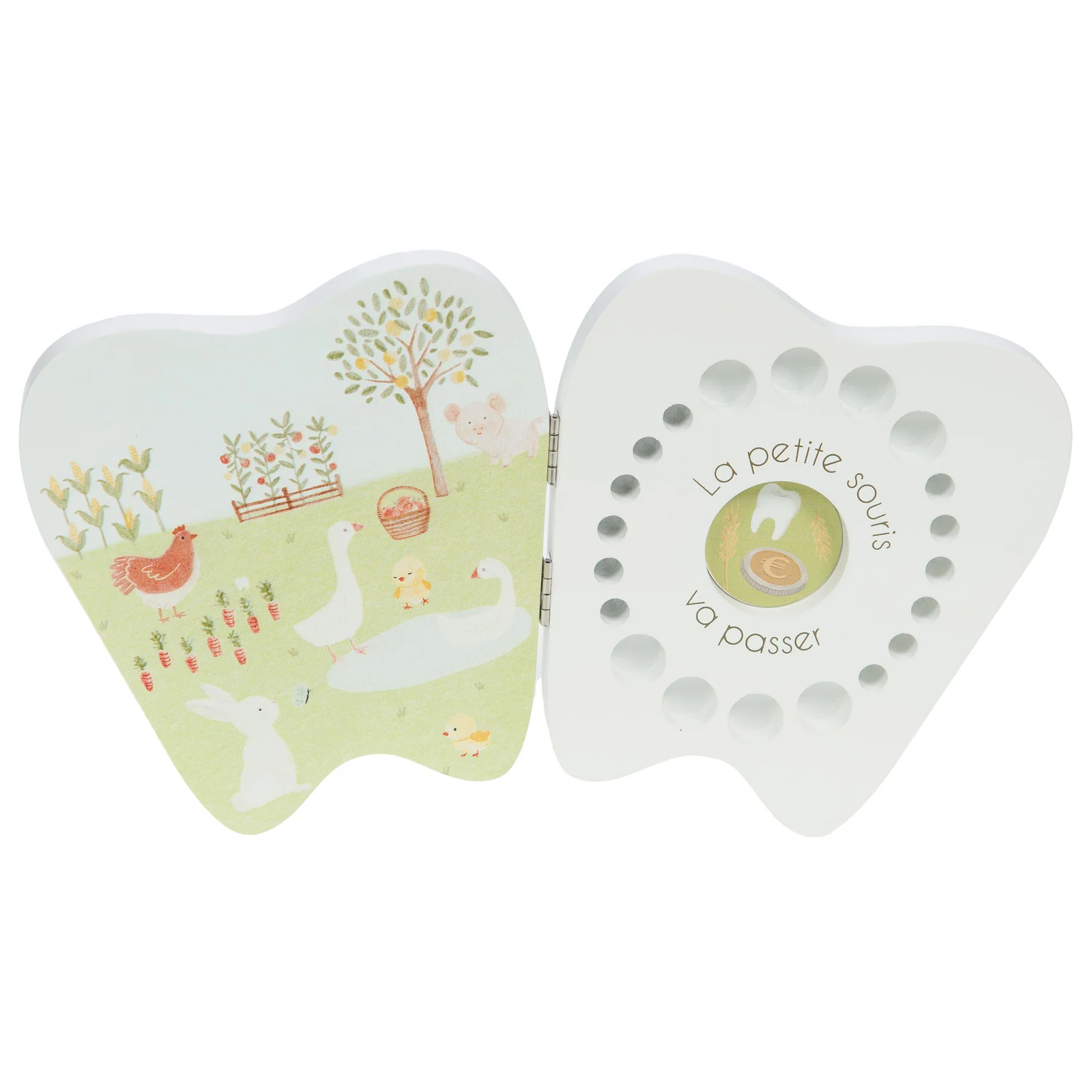 La Boîte à Quenottes Esteban de Cades Design est décorée de petits animaux de la ferme, idéale pour garder les quenottes des enfants tout en ajoutant une note champêtre à leur chambre.