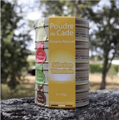 Boîtes X4 Encens En Poudre Sélection Vitaminée, Ambiance Cade. Sélection Vitaminée – Framboise-Cassis, Menthe Poivrée, Noix de Coco & Vanille. Découvrez la poudre de cade en petit format et profitez pleinement de ses bienfaits ! La sélection contient : – 1 boite de poudre de cade 35gr parfum Framboise-Cassis – 1 boite de poudre de cade 35gr parfum Menthe Poivrée – 1 boite de poudre de cade 35gr parfum Noix de Coco – 1 boite de poudre de cade 35gr parfum Vanille