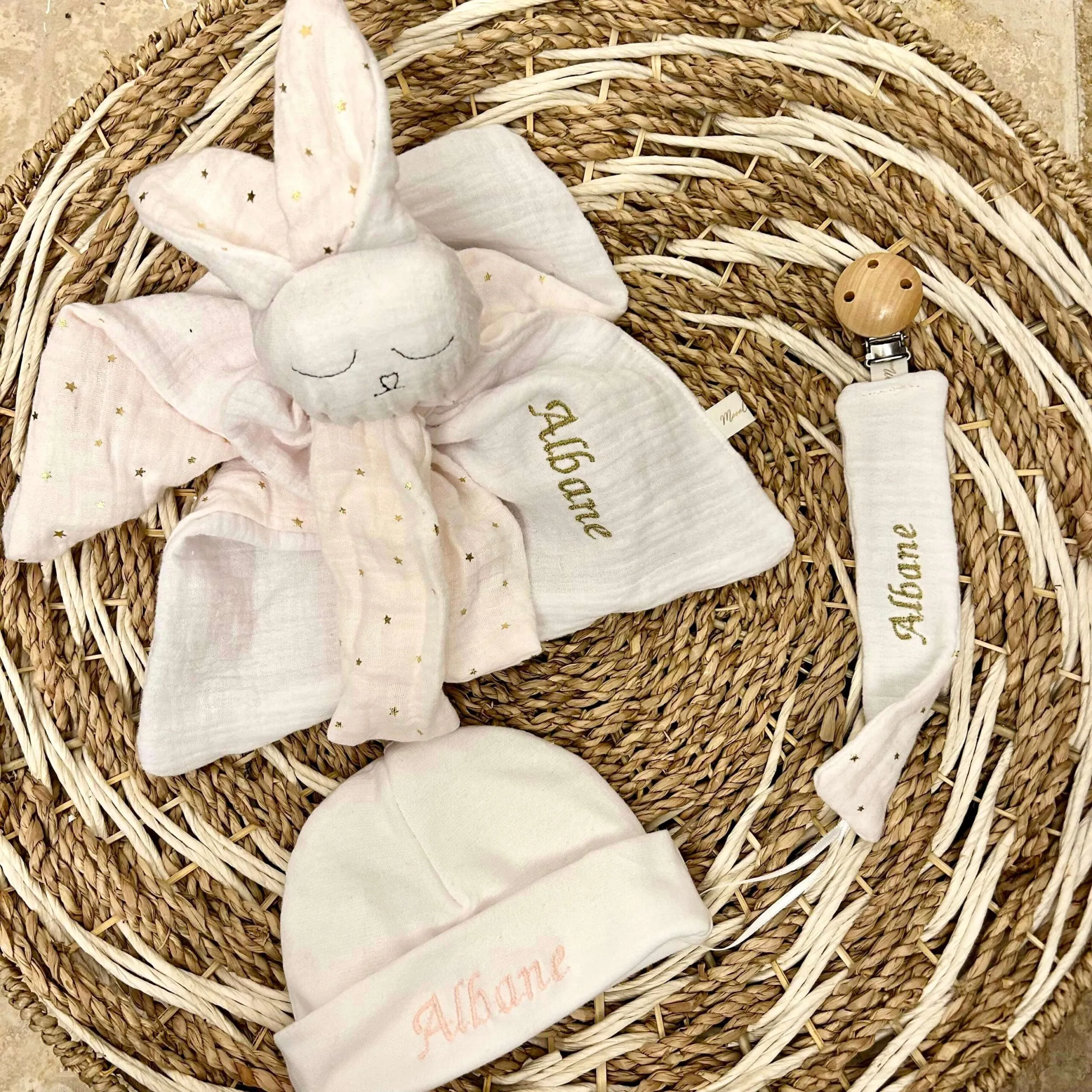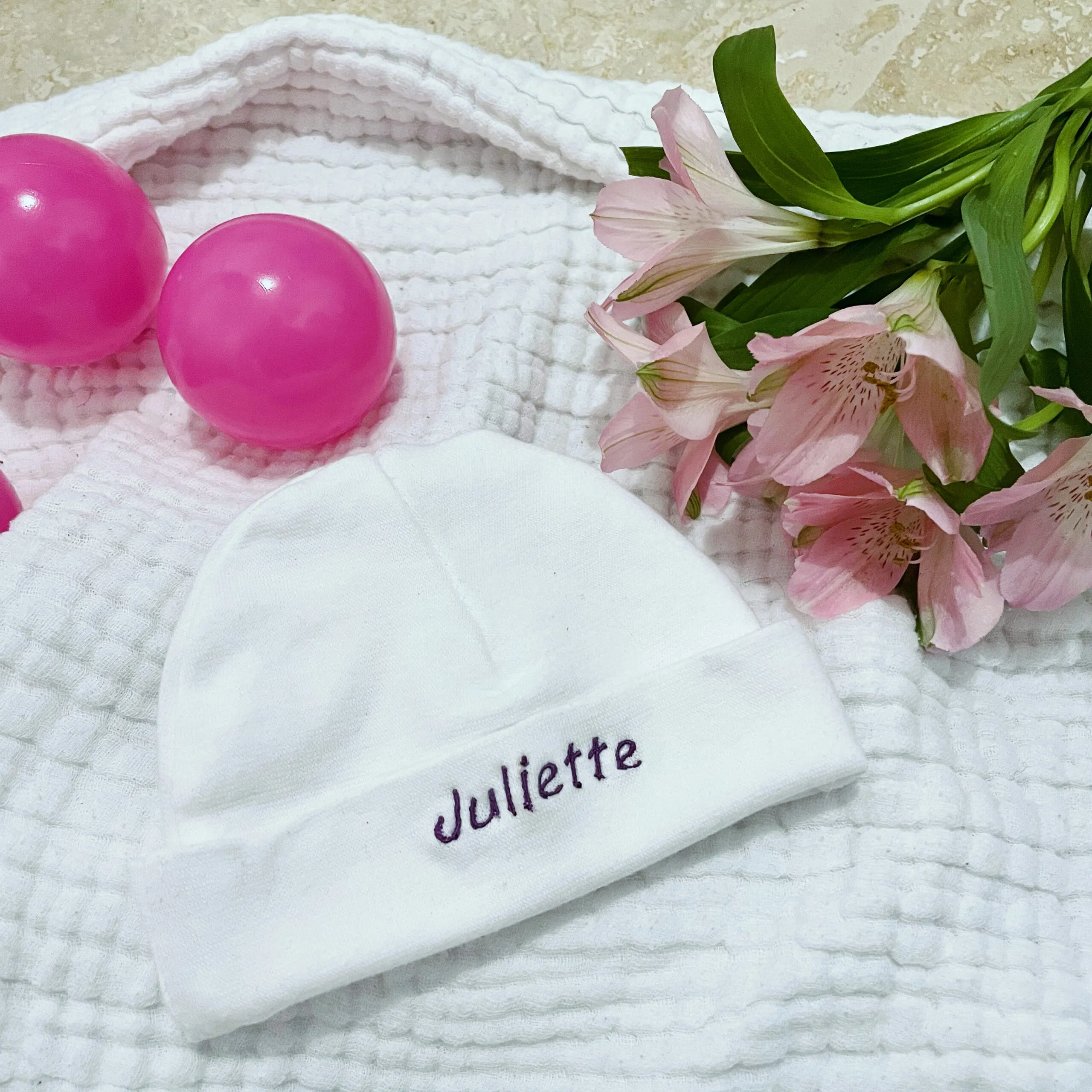 Bébé arrive ? Personnalisez son petit bonnet de naissance avec son prénom.