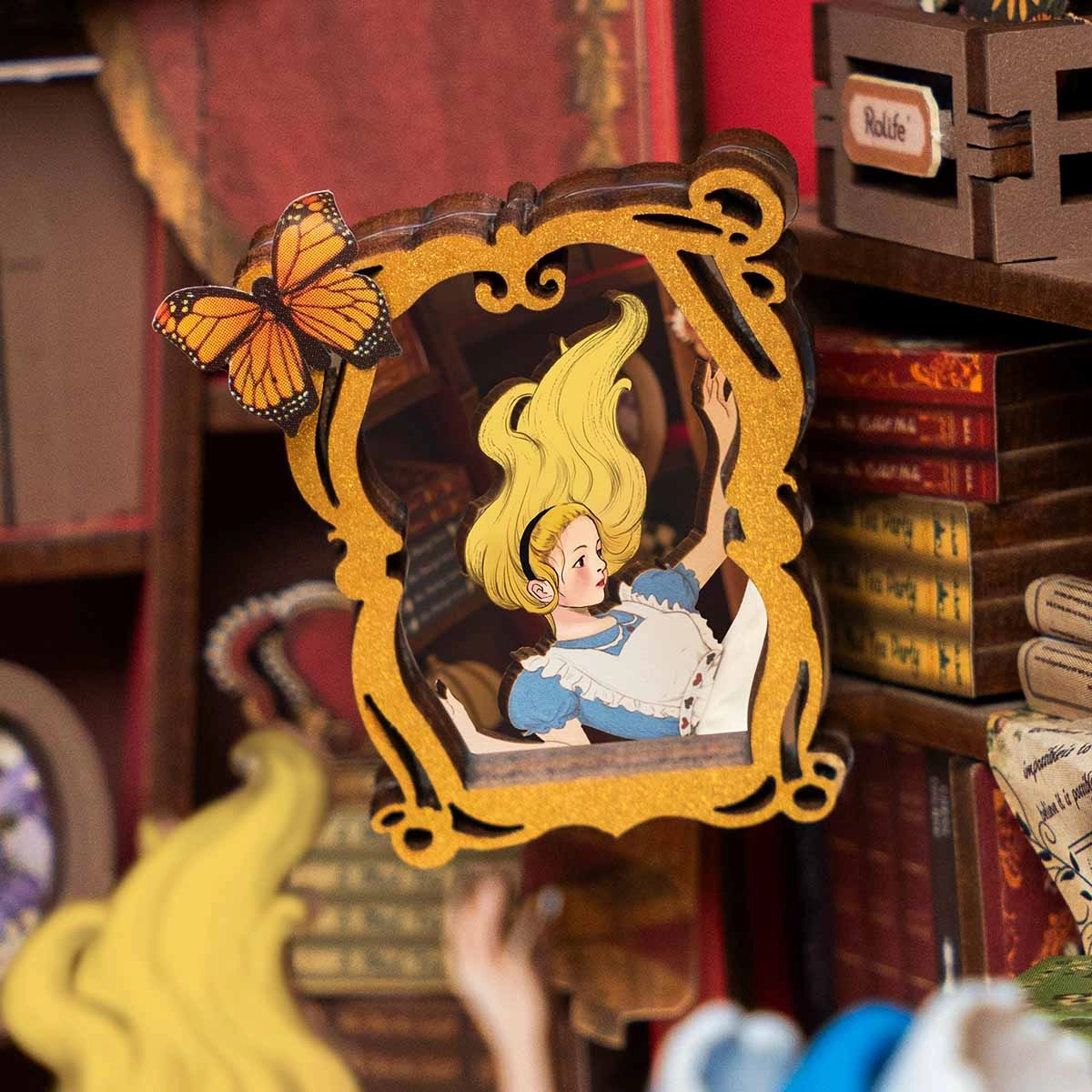 Chaque pièce du Book Nook est pensée pour raconter une histoire : des champignons géants, des horloges suspendues, des livres en désordre et des papillons colorés entourent Alice dans sa descente tourbillonnante. Les branches sculptées, les détails peints et les éléments superposés créent une impression de profondeur unique, comme si la scène sortait tout droit d’un rêve.
