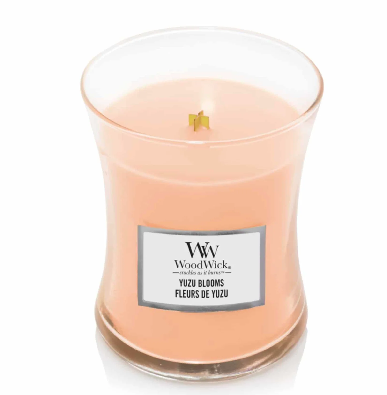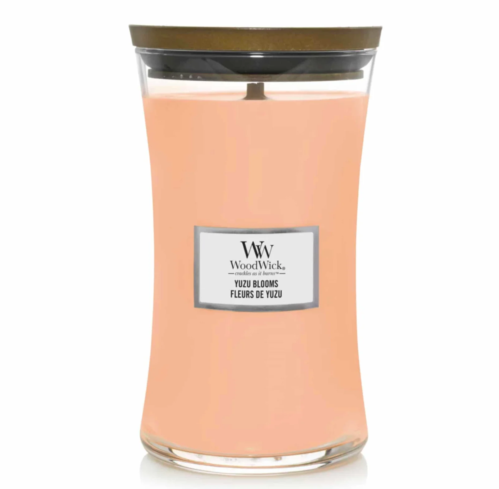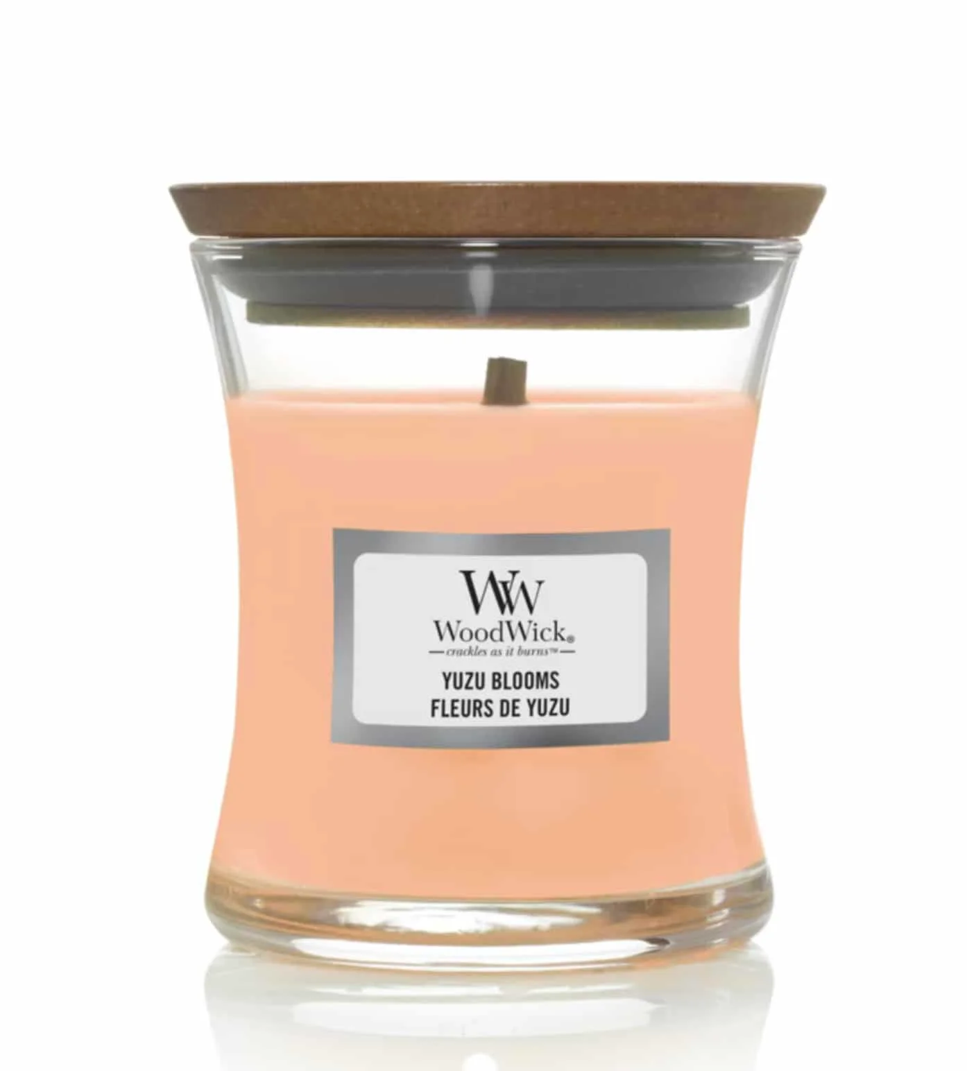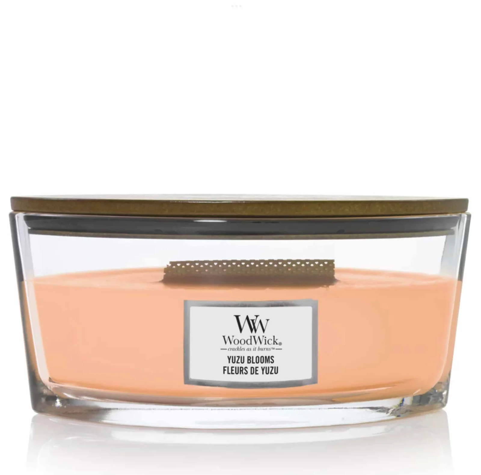 Bougie Fleur de Yuzu, Woodwick. Equilibre délicat entre l’acidité citron/mandarine et la douceur pivoine/fleurs d’agrumes .