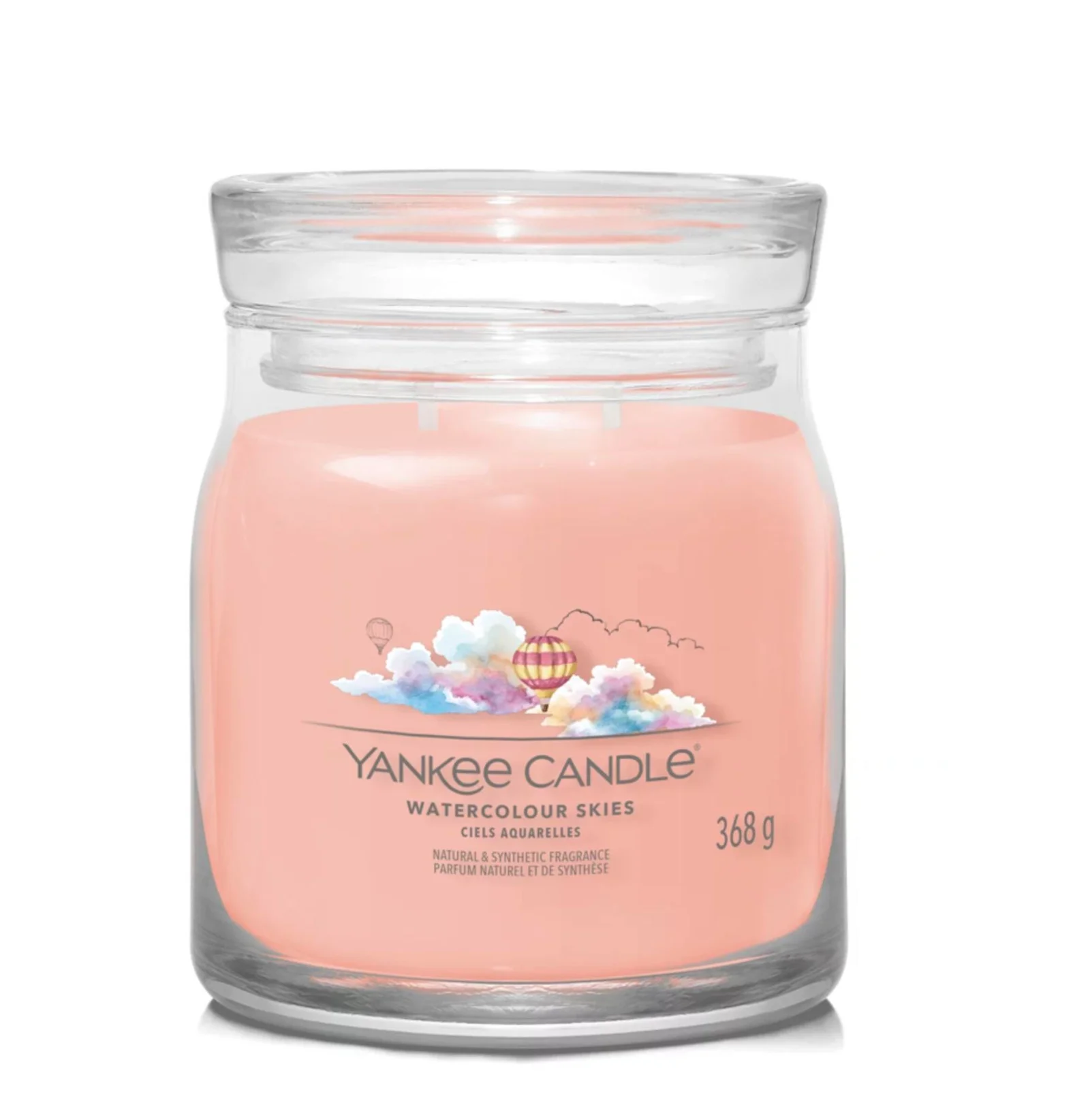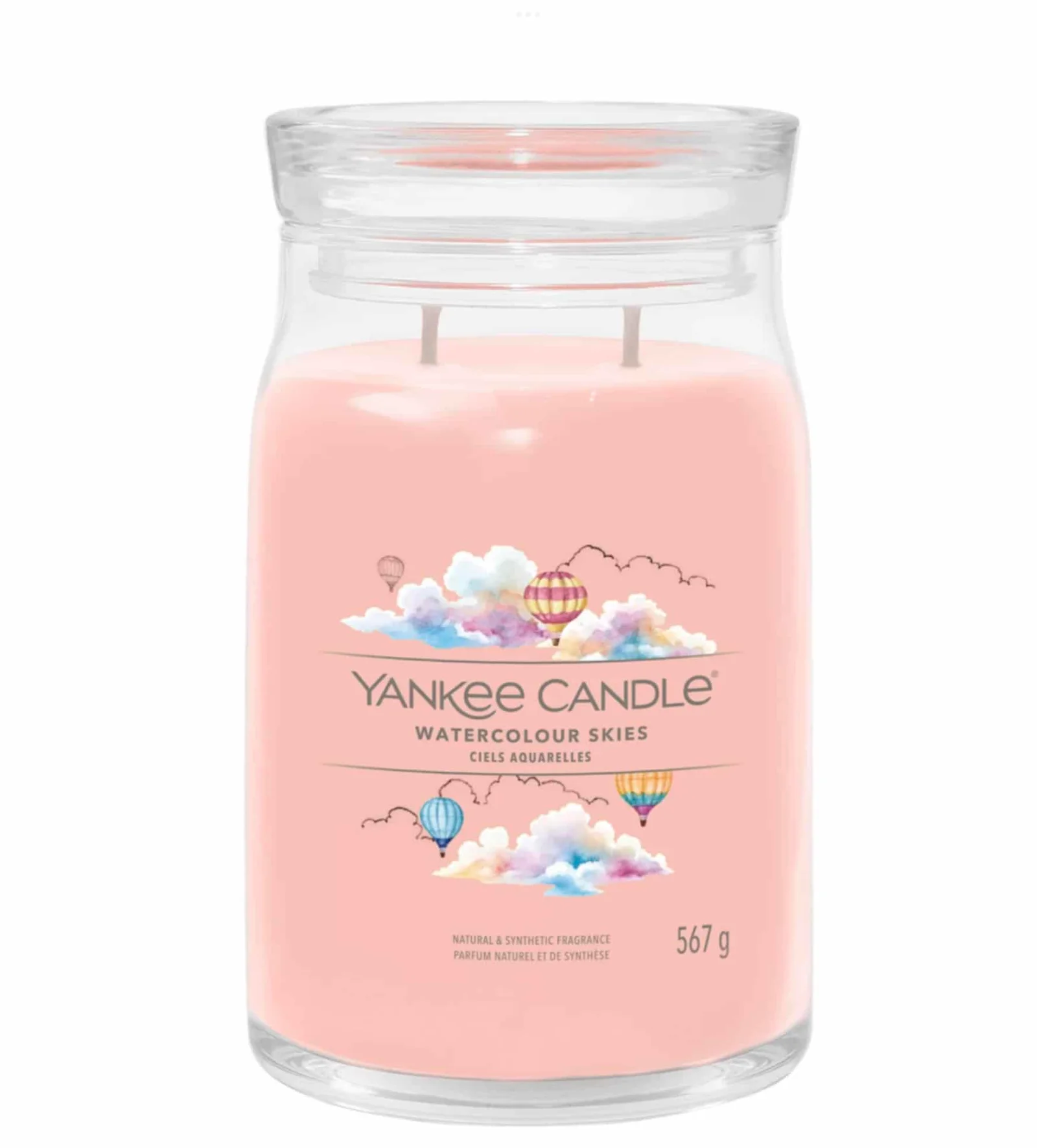 Bougie Signature Ciels Aquarelles . YANKEE CANDLE Un arc-en-ciel de couleurs apparaît dans le ciel, accompagné de parfums intrigants de cachemire, de jasmin et de musc. Cette bougie, d’une jolie couleur rosée, apportera une note de douceur à votre intérieur tout en ajoutant une touche féminine.