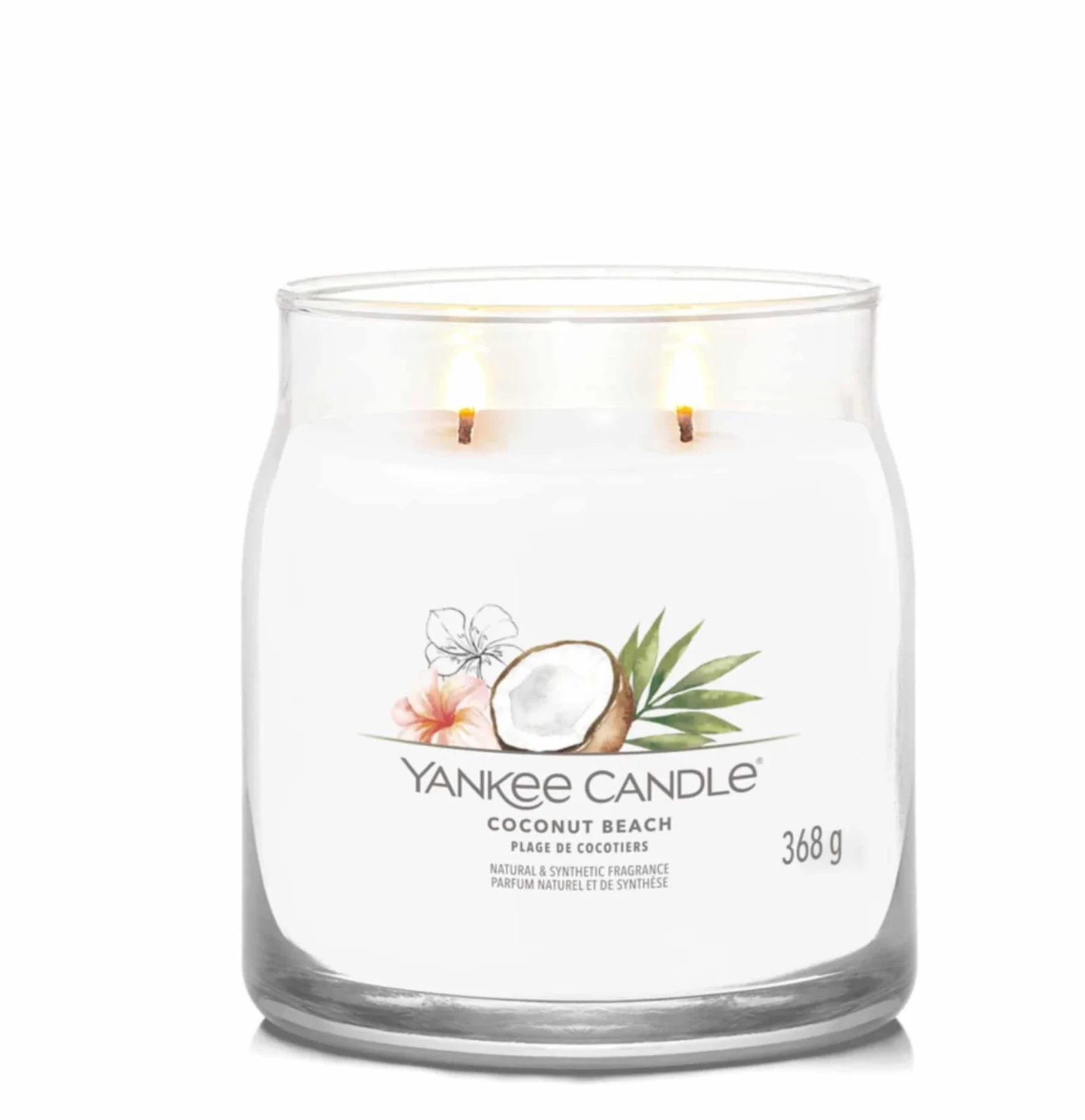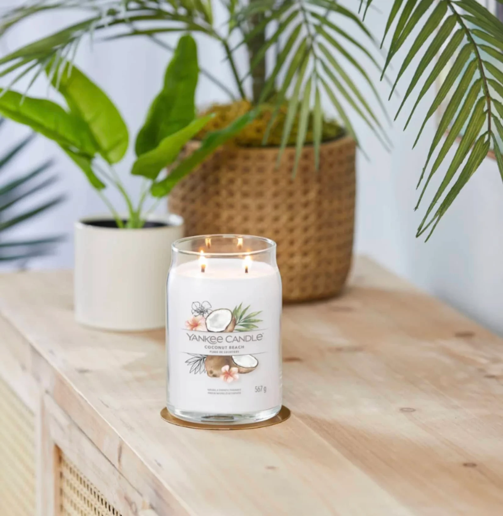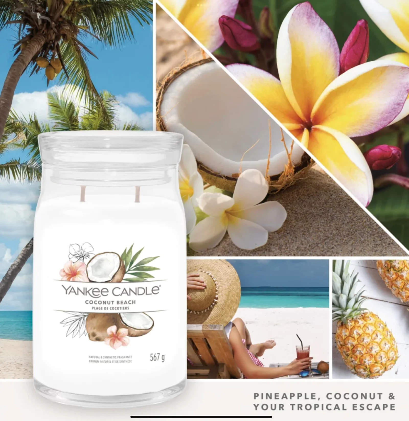 Bougie Signature plage de Cocotiers . YANKEE CANDLE Un air de vacances. Effluves de noix de coco, d’ananas, et de vanille. Les pieds dans le sable.