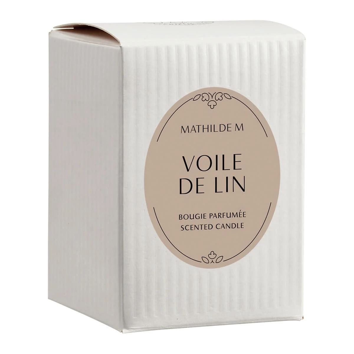 Bougie Voile de Lin, Mathilde M. Découvrez Voile de Lin, un parfum évoquant le souvenir délicat des notes de linge propre s’échappant d’une belle armoire ancienne. Cette senteur enveloppante offre des notes poudrées de rose et de violette, se fondant sur un lit de musc blanc agrémenté de fleurs de lin.