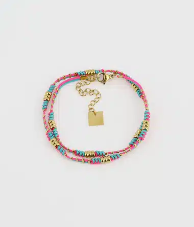 Bracelet Bogota Acier DorĂ© & Fuchsia, Zag . Ce bracelet multi-rang en coton naturel est parsemĂ© de petits Ă©lĂ©ments en acier dorĂ© Ă l’or fin. Il se tourne deux fois autour du poignet.