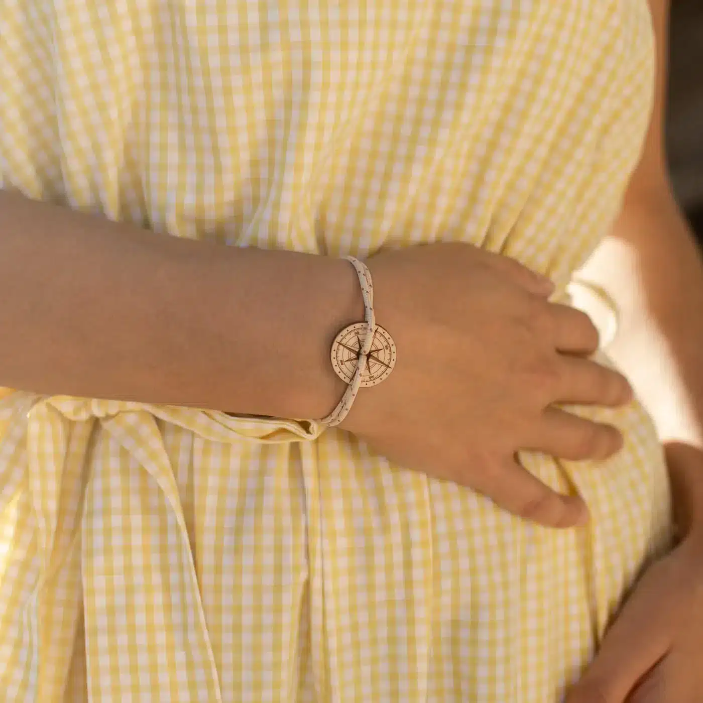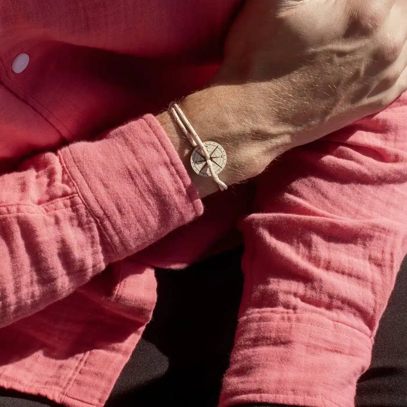 Bracelet Bois Ambre, Beige et Rose, Rose Des Vents, Le Vent à la Française. Le Vent à la Française fait voyager la confection et le savoir-faire français à travers la création de bracelets ornés de son iconique Rose des Vents.
