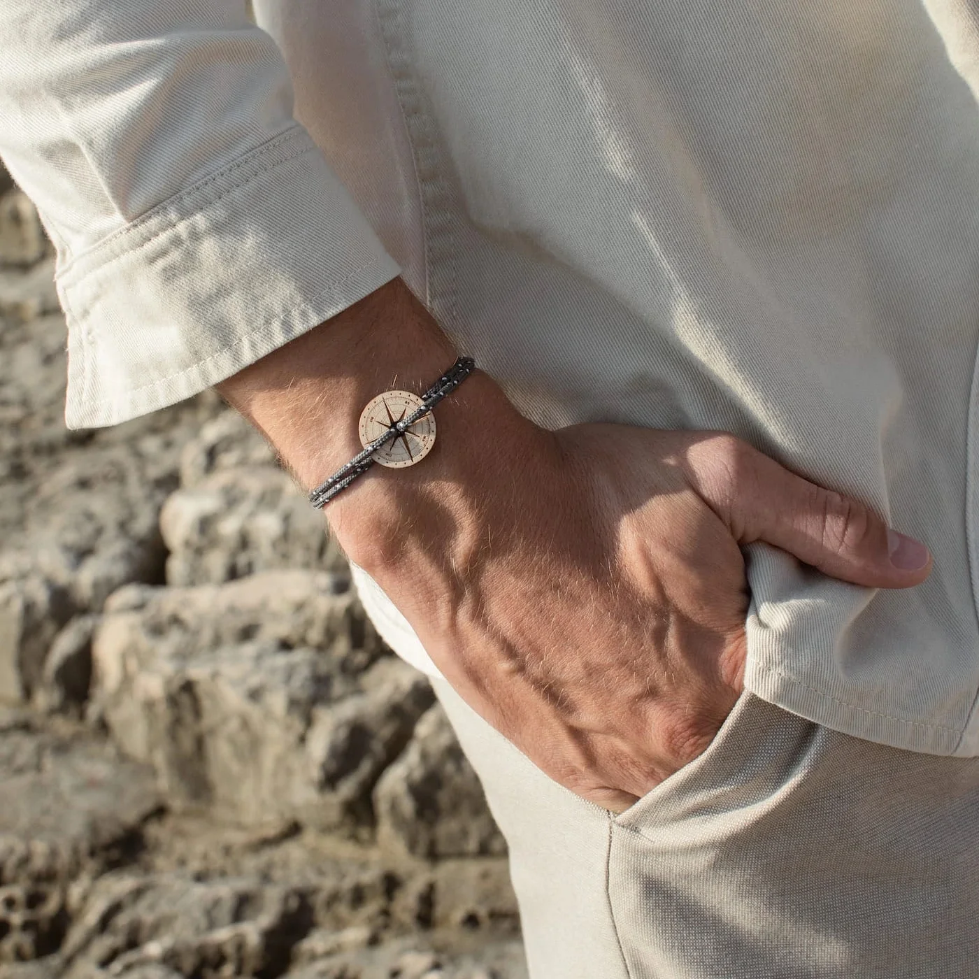 Bracelet Bois Gris et Blanc, Le Vent à la Française. Le Vent à la Française fait voyager la confection et le savoir-faire français à travers la création de bracelets ornés de son iconique Rose des Vents. Ce symbole fort, reflet du voyage, de la liberté et de l’aventure, est façonné sur chacune de nos médailles. Conçus pour durer à vie, ils sont l’aboutissement d’une parfaite alliance entre ateliers d’exception. Ce symbole fort devenu image de la marque, est façonné sur chacune des médailles quelque soit le matériau.