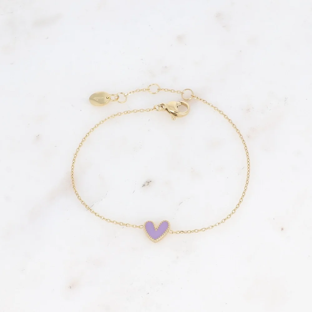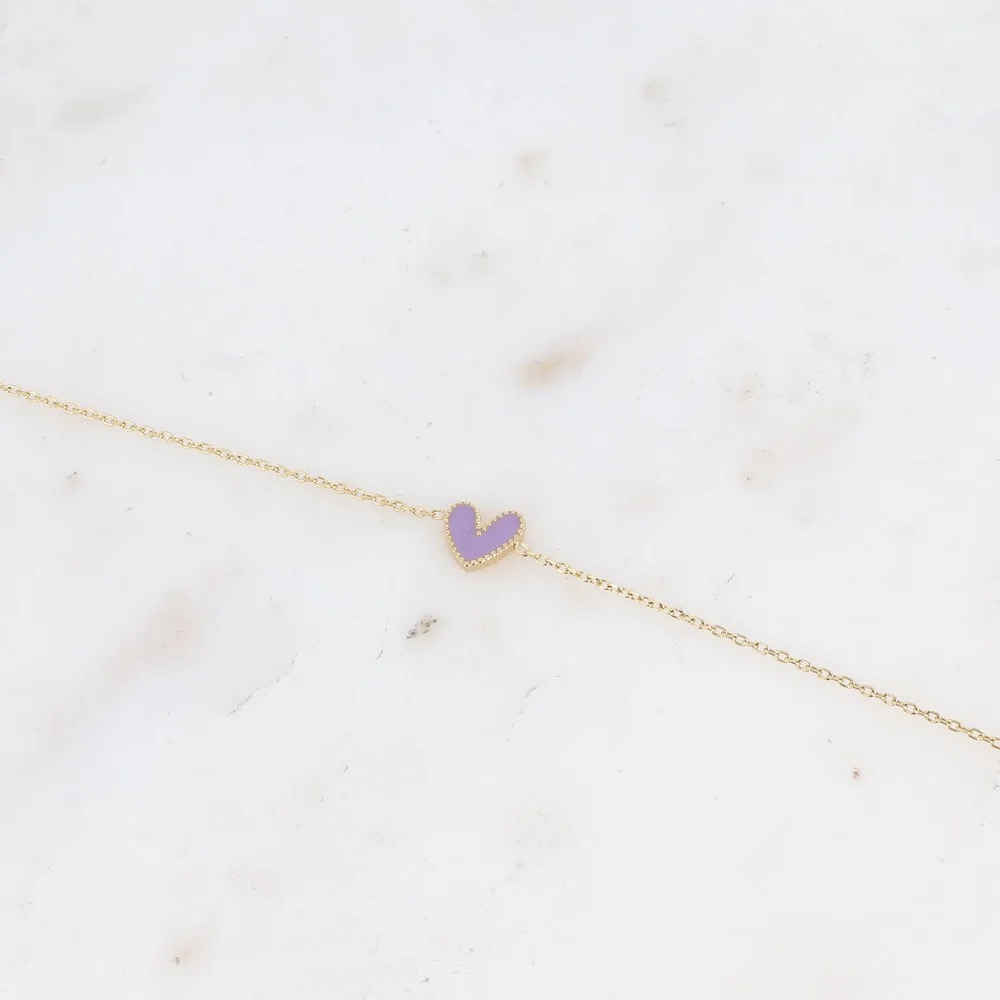 Bracelet Cœur Lilas Un délicat bracelet en chaîne dorée avec son petit cœur en émail lilas. Idéal pour sa chérie !