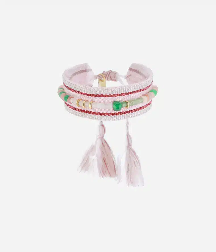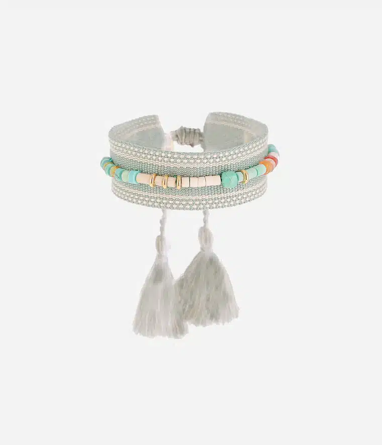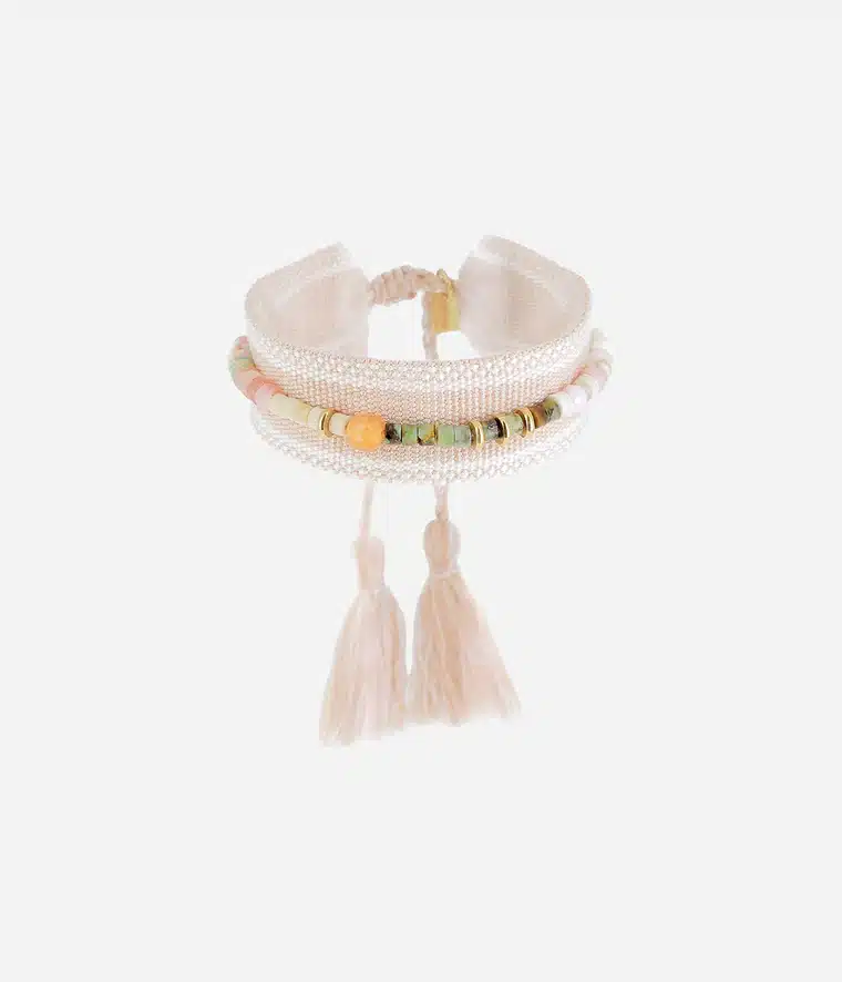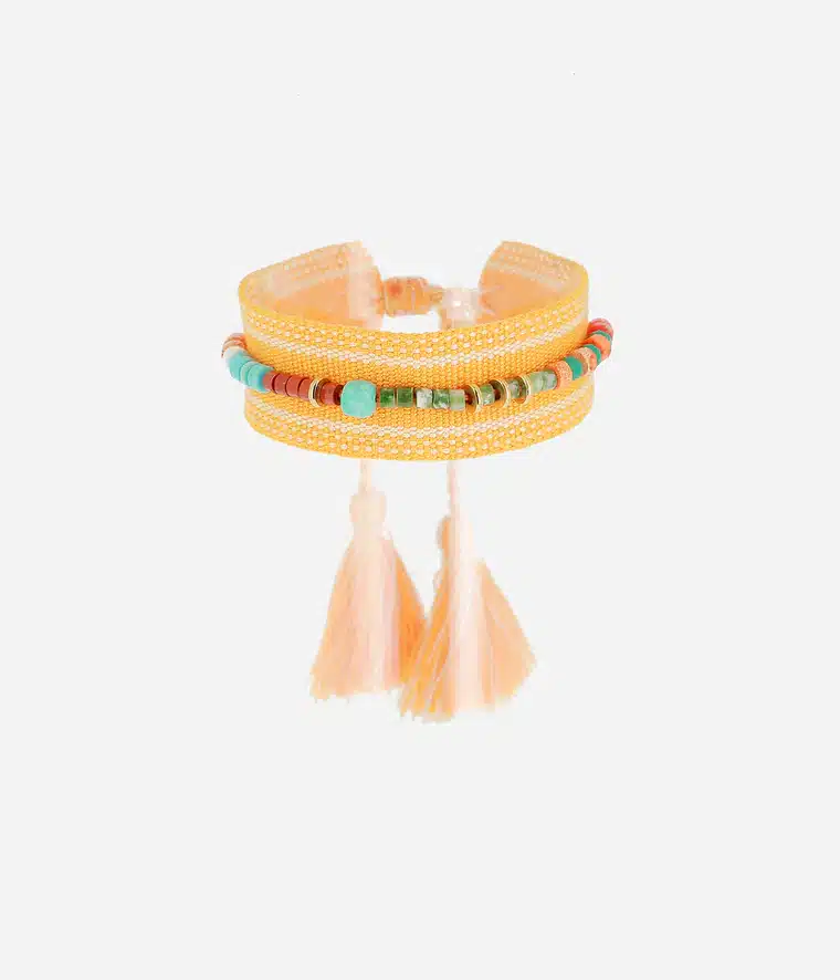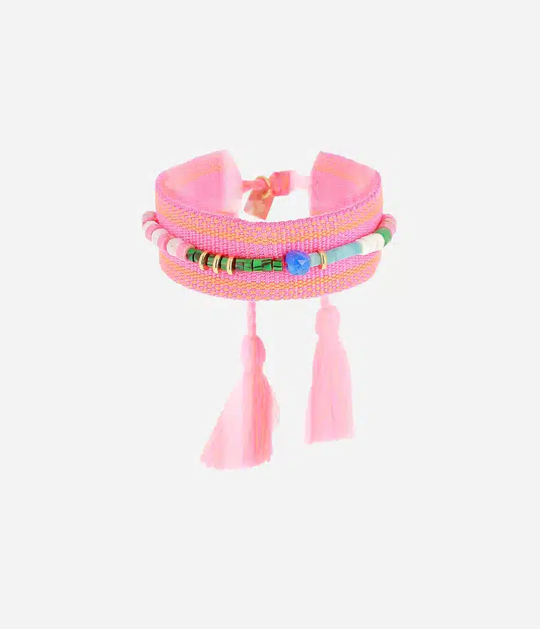 Bracelet en tissu de couleur serti de petites perles sur le dessus. Il se ferme et se règle grâce à des pompons qui coulissent.