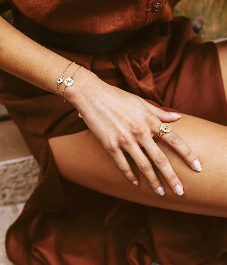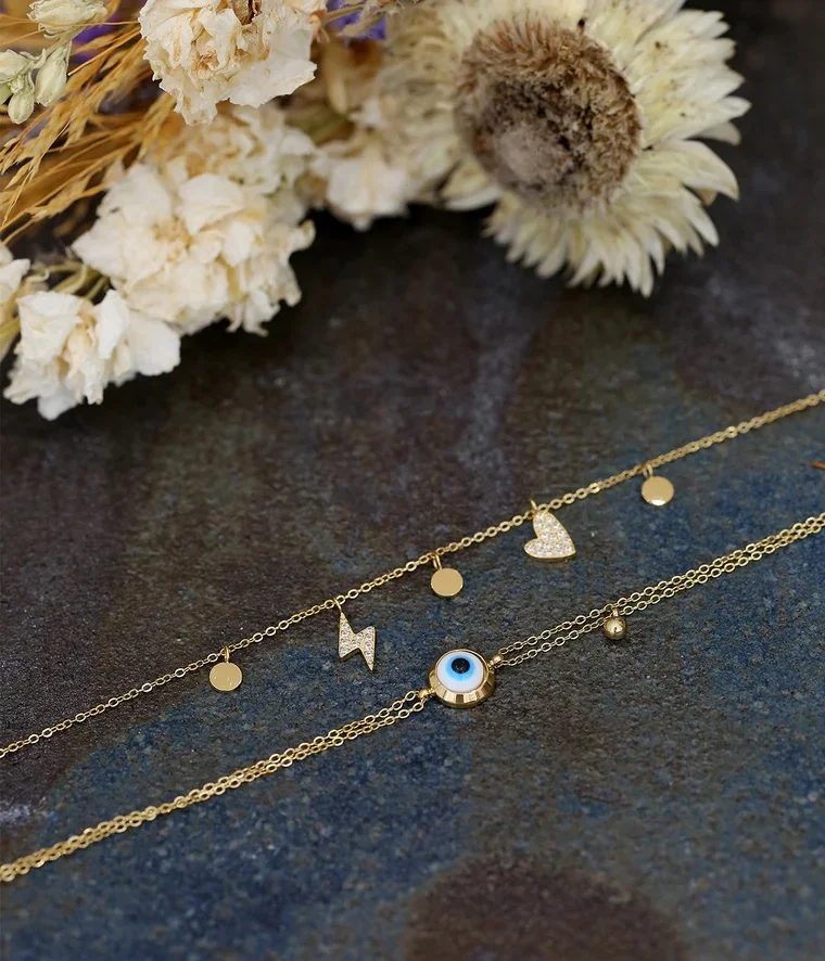 Ce bracelet à double chaîne est disponible en acier uni ou doré à l’or fin et est orné d’un petit Å“il coloré serti de métal.