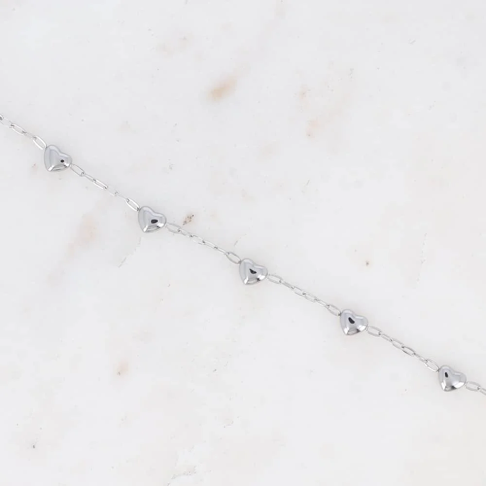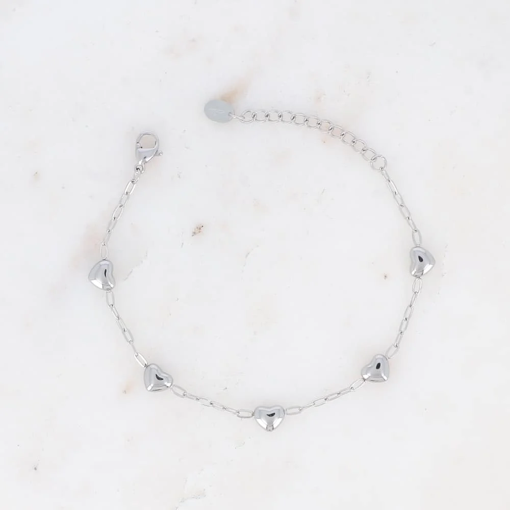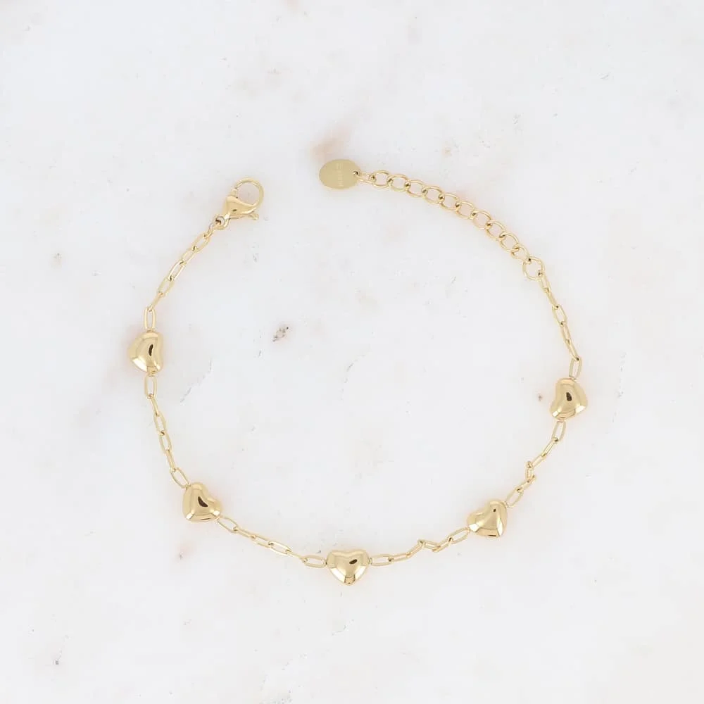 Bracelet Pampilles Cœurs . Délicat bracelet en acier inoxydable doré, orné d’une multitudes de cœurs bombés. Parfait pour celles qui aiment les bijoux très fins . Existe en version dorée et rhodium .