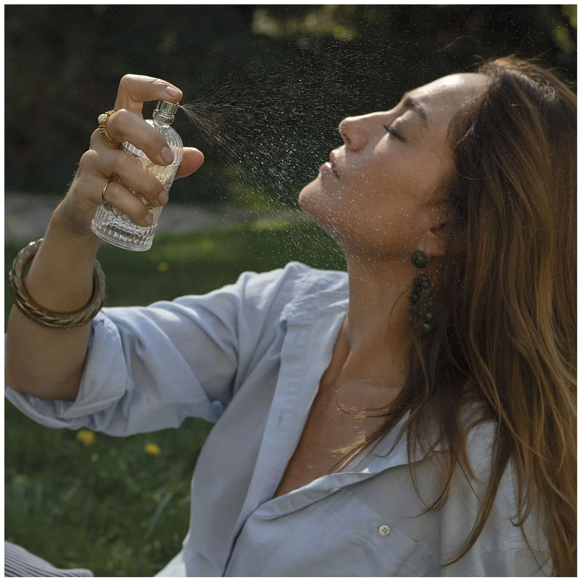 Brume Parfumée Corps et Cheveux, Mathilde M. Cette brume délicate enveloppe corps et cheveux d’un voile exquis de parfum. Composée à 95% d’ingrédients naturels et légèrement concentrée en alcool, elle offre une fragrance subtile sans agresser la peau ni les cheveux exposés au soleil.