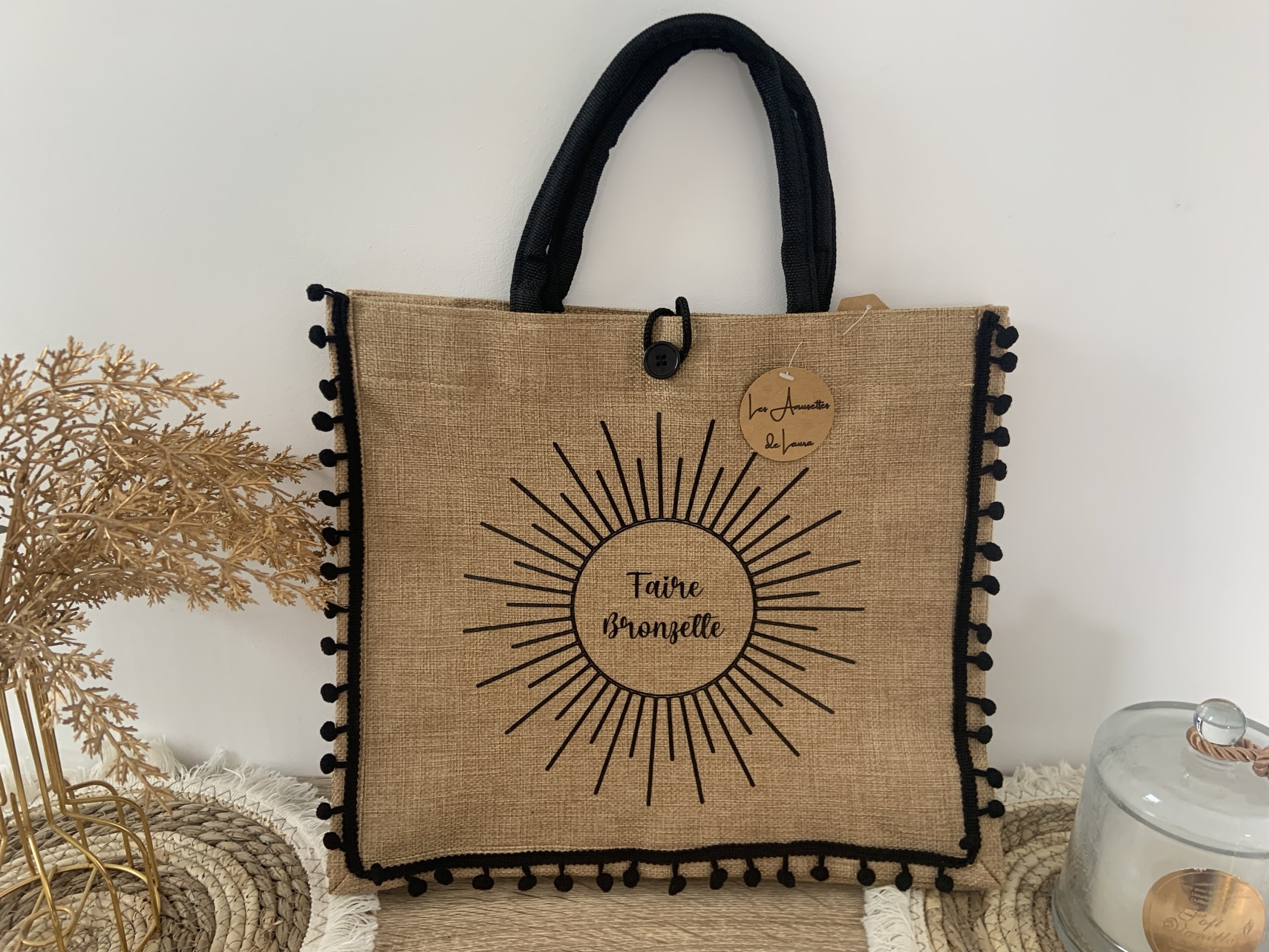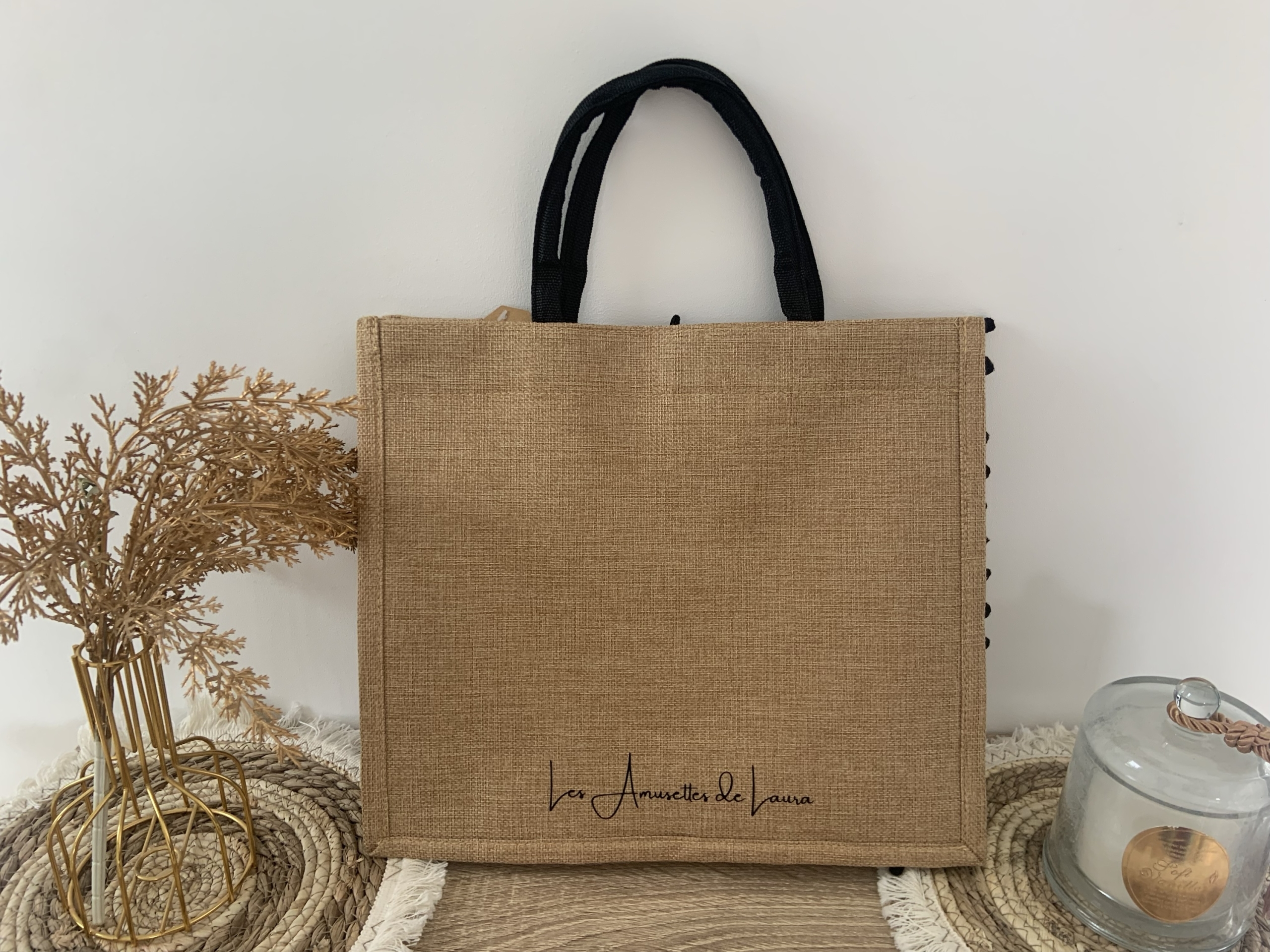 Cabas en jute doublé Faire bronzette à pompons 34x14x30 cm environ Fermeture par bouton