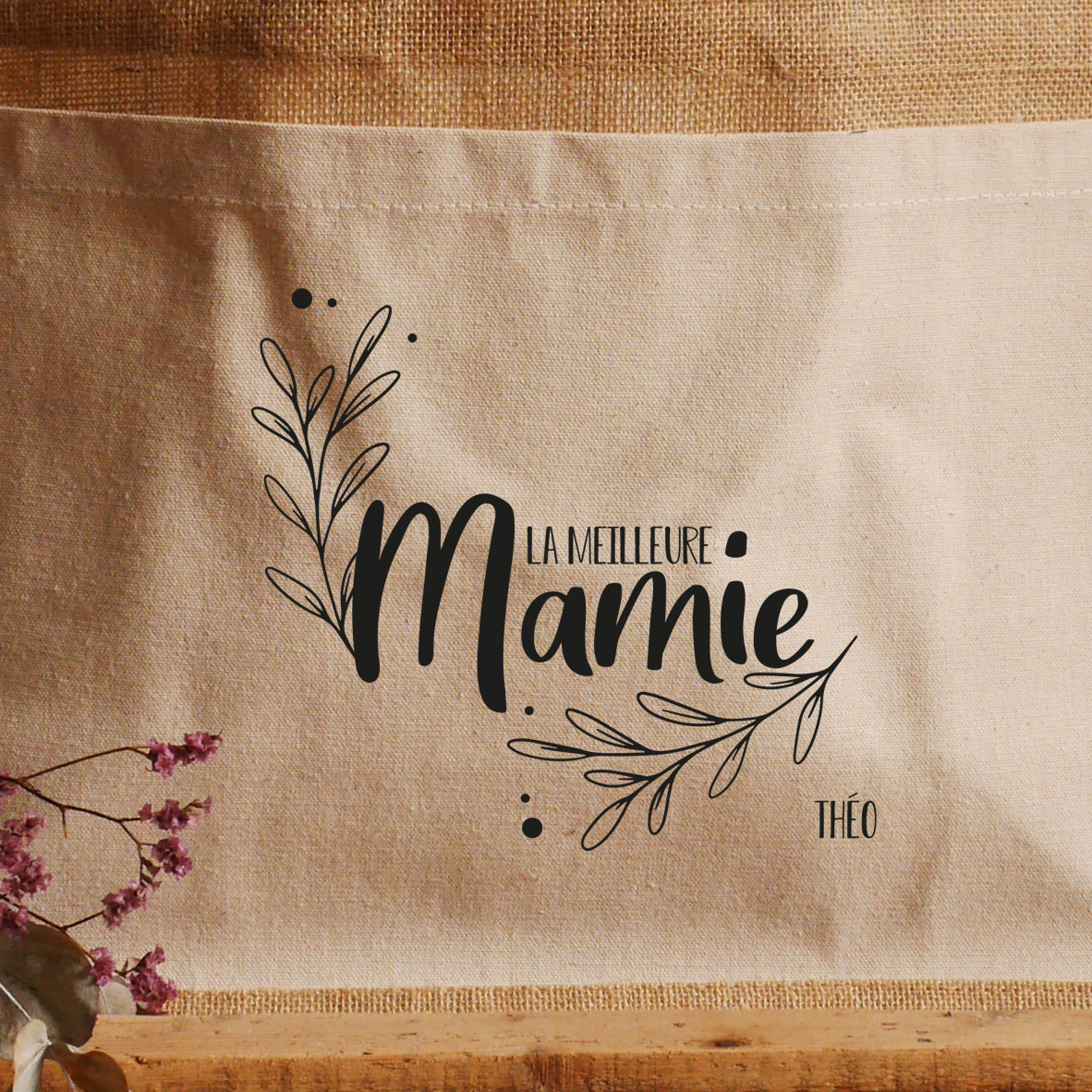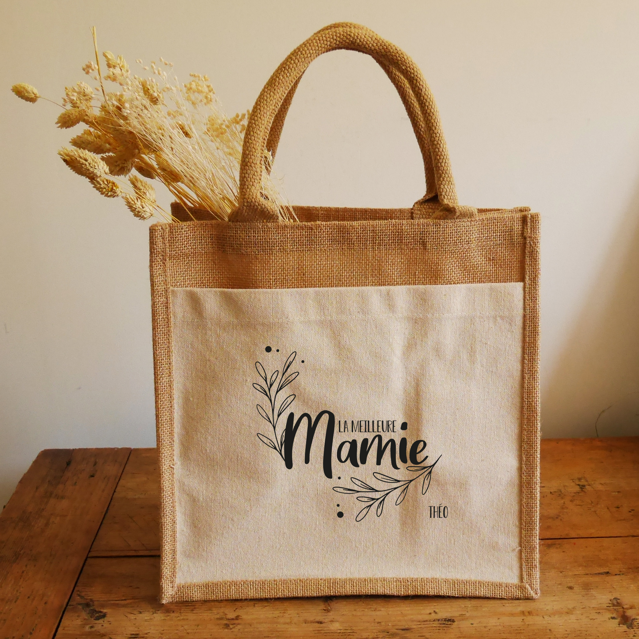 Vous souhaitez dire à votre mamie que vous l’aimez ? Vous souhaitez qu’elle se rappelle chaque jour à quel point elle compte pour vous ? Ce cabas la suivra au quotidien ! Il est pratique grâce à sa poche avant et joli grâce à ses beaux matériaux ; le coton et la toile de jute. Ce cabas est imprimé en Savoie, dans mon atelier. Vous avez la possibilité de le personnaliser en ajoutant le prénom du ou des petit(s) enfant(s). Dimensions : 30 x 30 x 19 cm équivalent à 14 litres. Existe également en 42 x 33 x 19 cm…