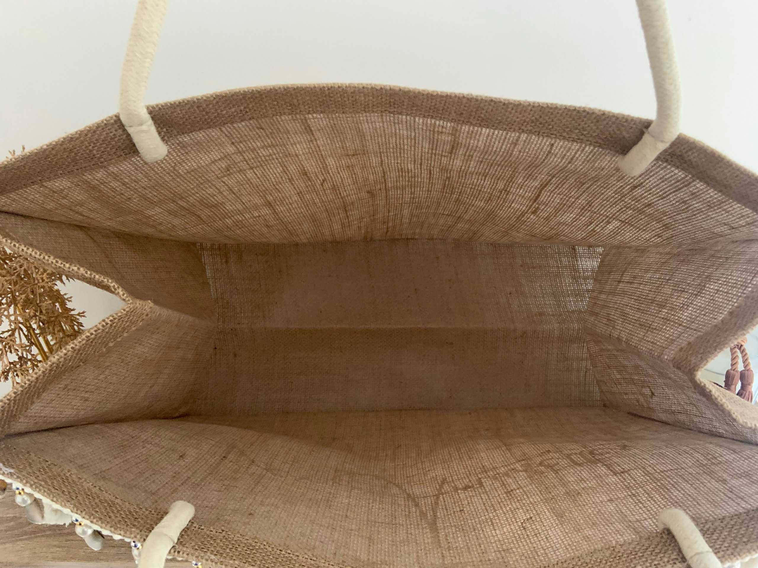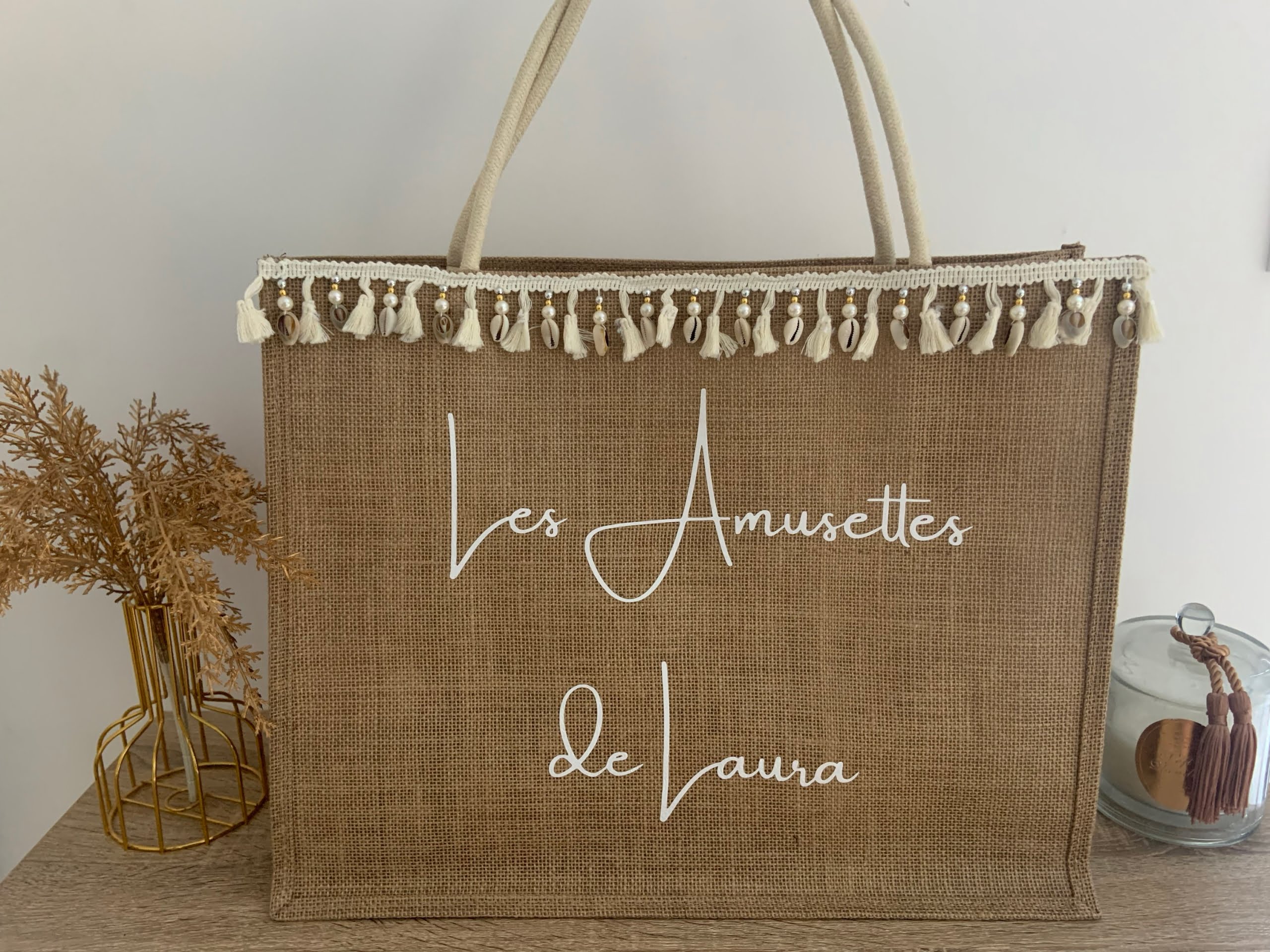 Cabas de Plage en jute Taille 46 x37 x22 cm Anse corde beige Inscription personnalisée sur demande