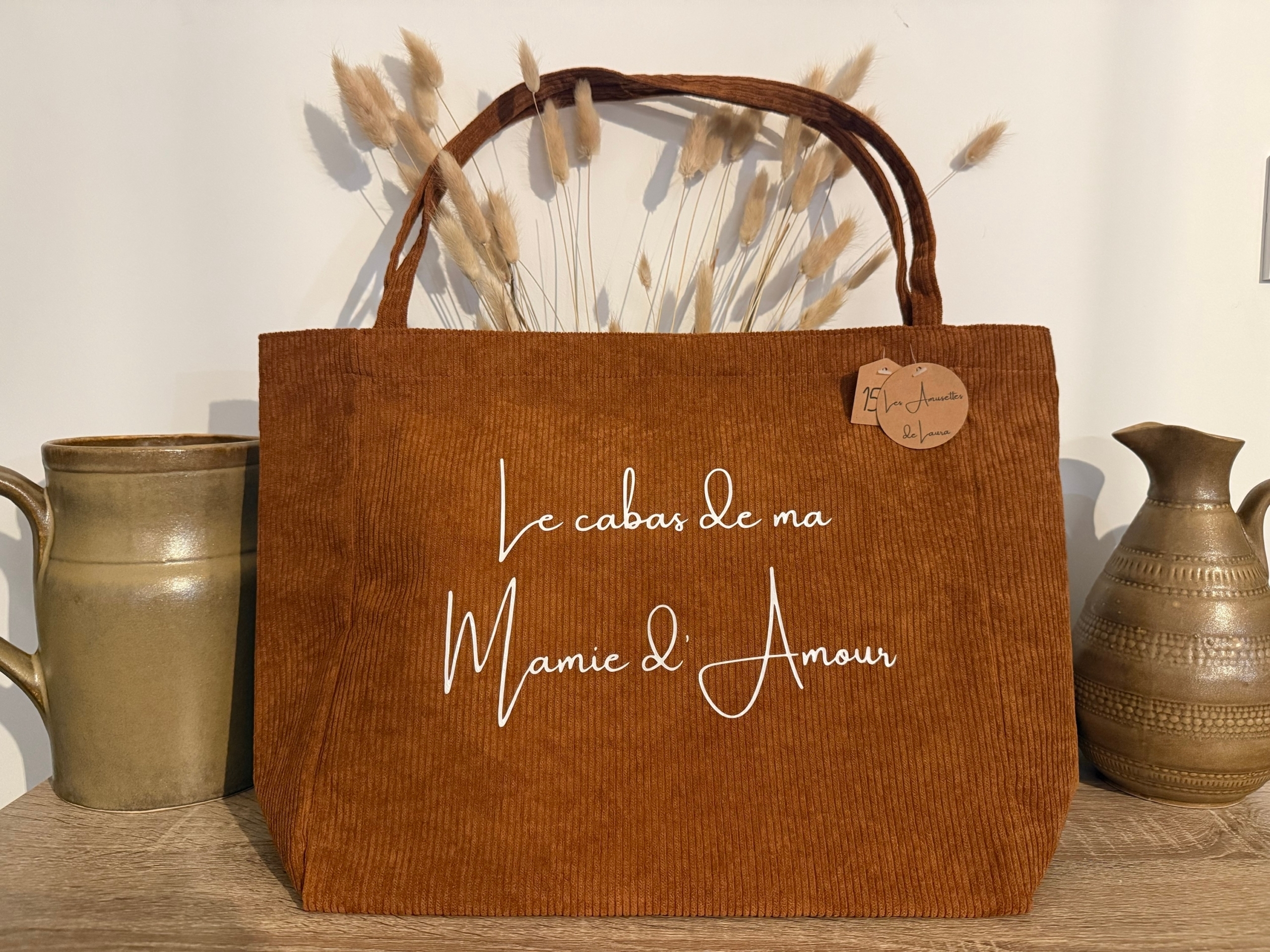 Cabas en velours côtelé Coloris Écureuil Inscription » Le Cabas de ma Mamie d’Amour » 34x13x32 cm Possibilité de personnaliser sur demande