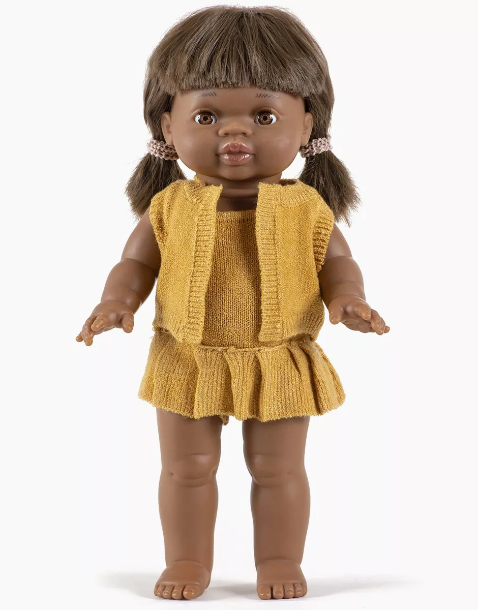 Cardigan Léonie en tricot pour poupées Minikane Babies 28cm, Gordis 34/37cm et Cuties 36cm.