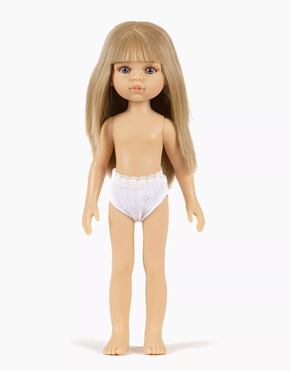 Carla, poupée Amigas vendue avec sa culotte en dentelle. – Taille de 32 cm – Corps en en vinyle sans phtalate au léger parfum de vanille – Cheveux longs couleur blond avec frange – Yeux bleus avec cils, sourcils peints sur visage Compatible avec l’ensemble du dressing Amigas. Fabriquée en Espagne.