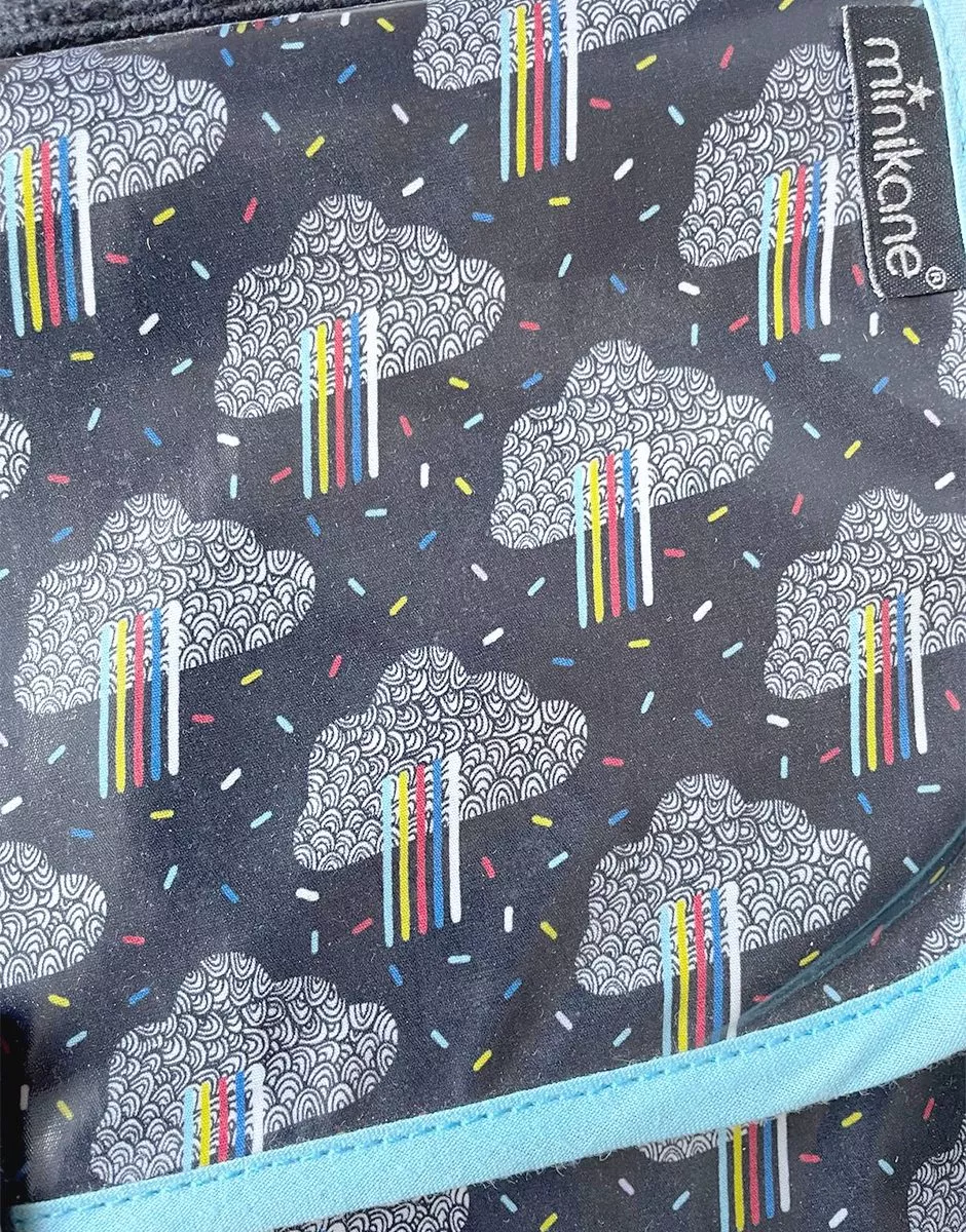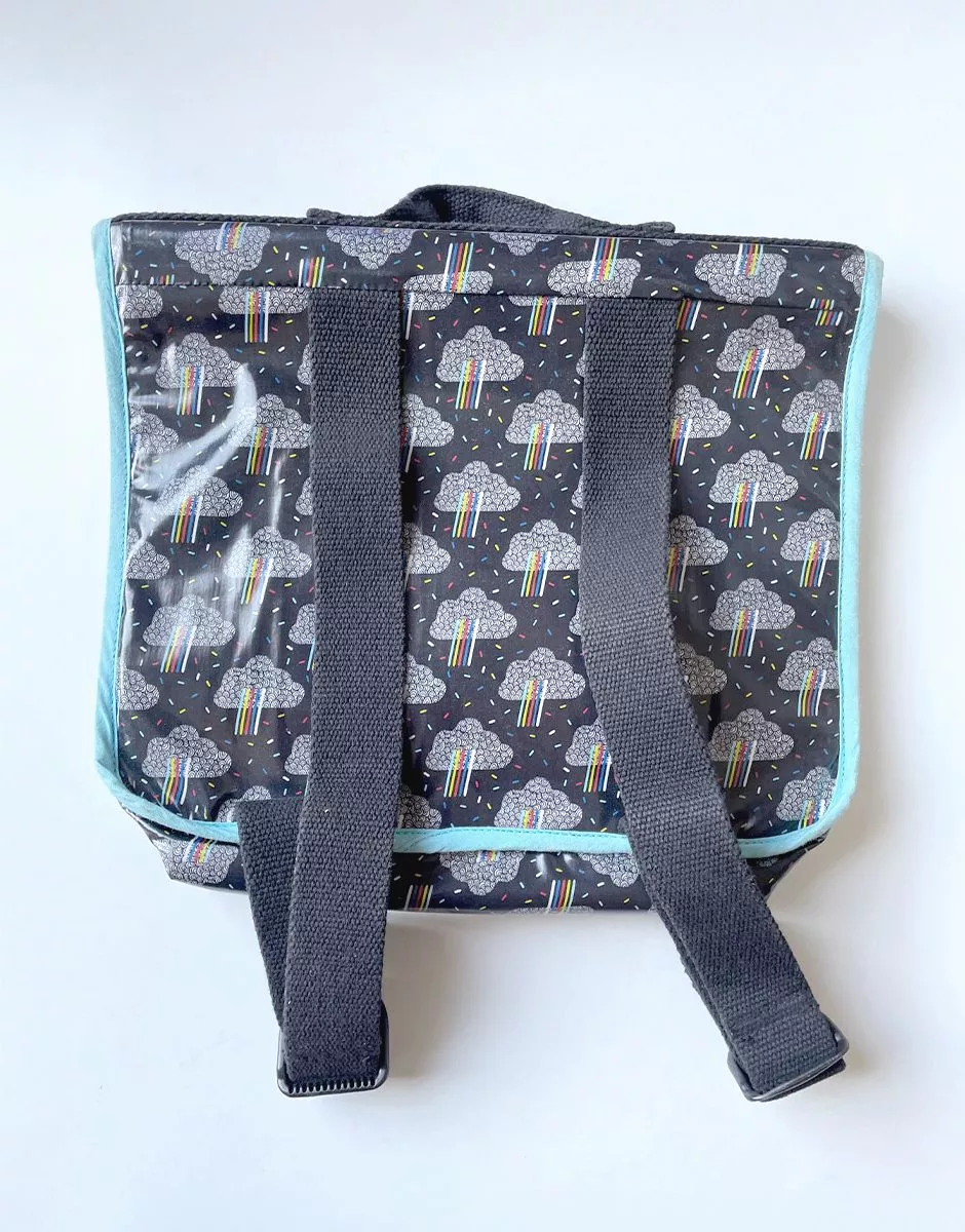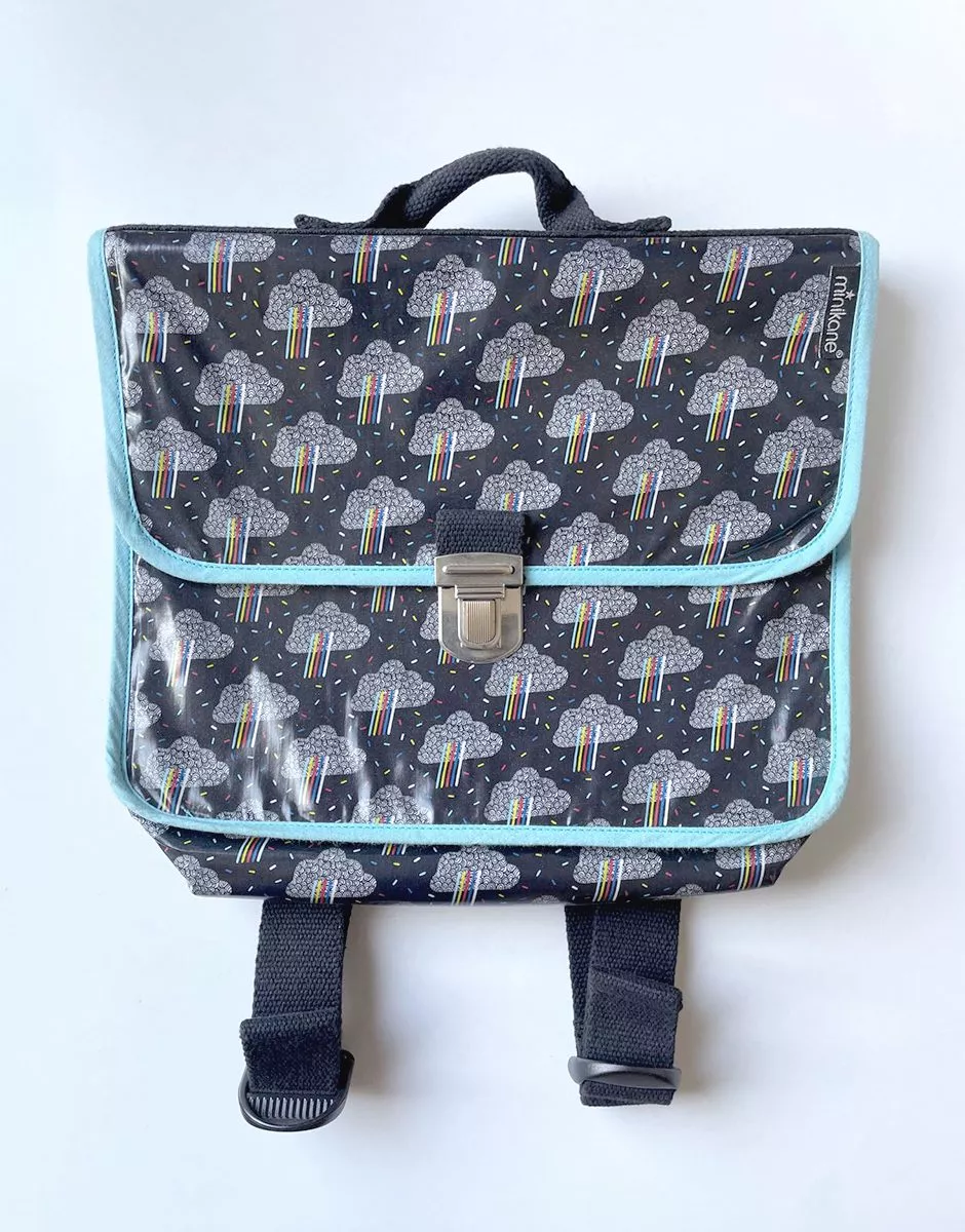 Cartable CP pour enfant en coton enduit Clouds avec fermeture à clips. Mensurations : 34,5cm x 28cm x 11,5cm Défauts : Modèles d’atelier premier de série. Design, & développement MADE IN FRANCE  Â