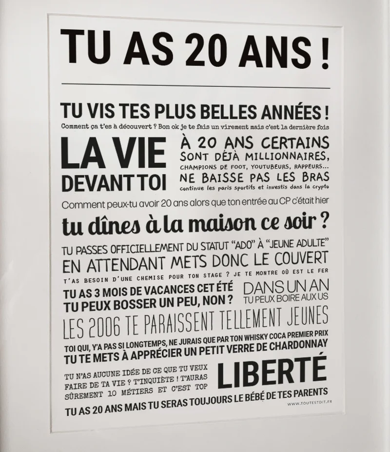 Carte 20 ans – TOUT EST DIT Offrez un message plein d’humour avec les cartes TED !Disponibles pour tous les âges (18, 20, 30, 40, 50 ans) et les 12 signes du zodiaque, ces cartes double A5 avec enveloppe allient design moderne, phrases drôles et touche d’affection.Idéales pour souhaiter un anniversaire ou simplement faire sourire, elles sont le choix parfait pour un mot original et tendance