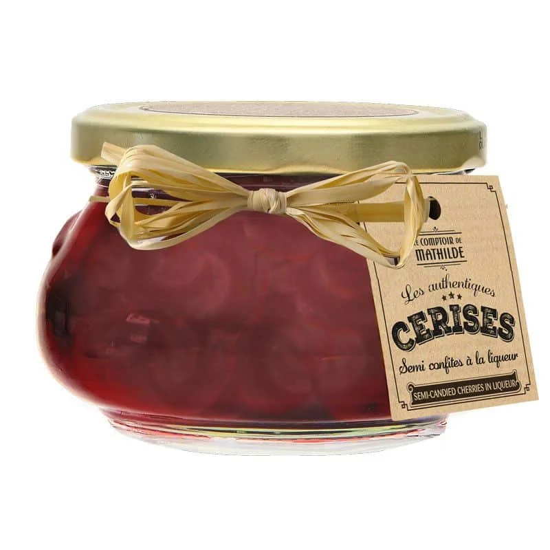 Cerises Confites à la Liqueur, Le Comptoir de Mathilde. Clôturez en beauté un repas de fêtes avec nos cerises semi-confites authentiques, délicatement macérées dans une liqueur (15% vol). Vous pouvez aussi agrémenter une boule de glace vanille de ces délicieuses pépites.