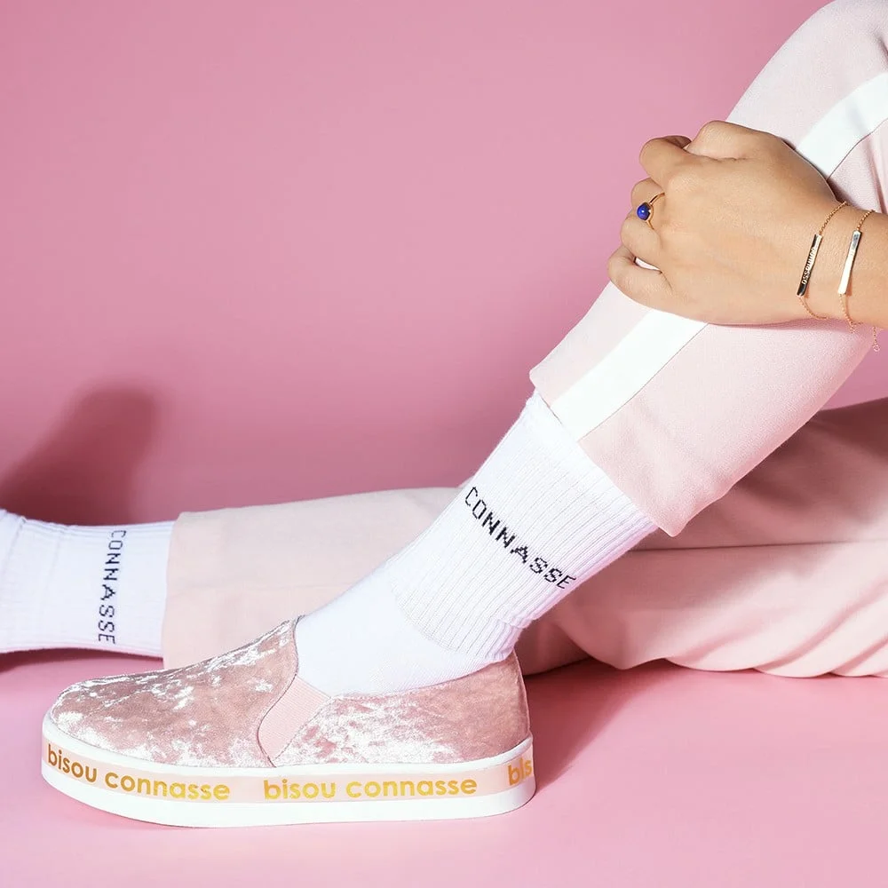 Chaussettes Blanches CONNASSE, Félicie Aussi. Chaussettes pour ne pas se prendre au sérieux et rire de tout (surtout de soi-même!!). Merveilleuses avec les claquettes :-)) . Taille 36-40.