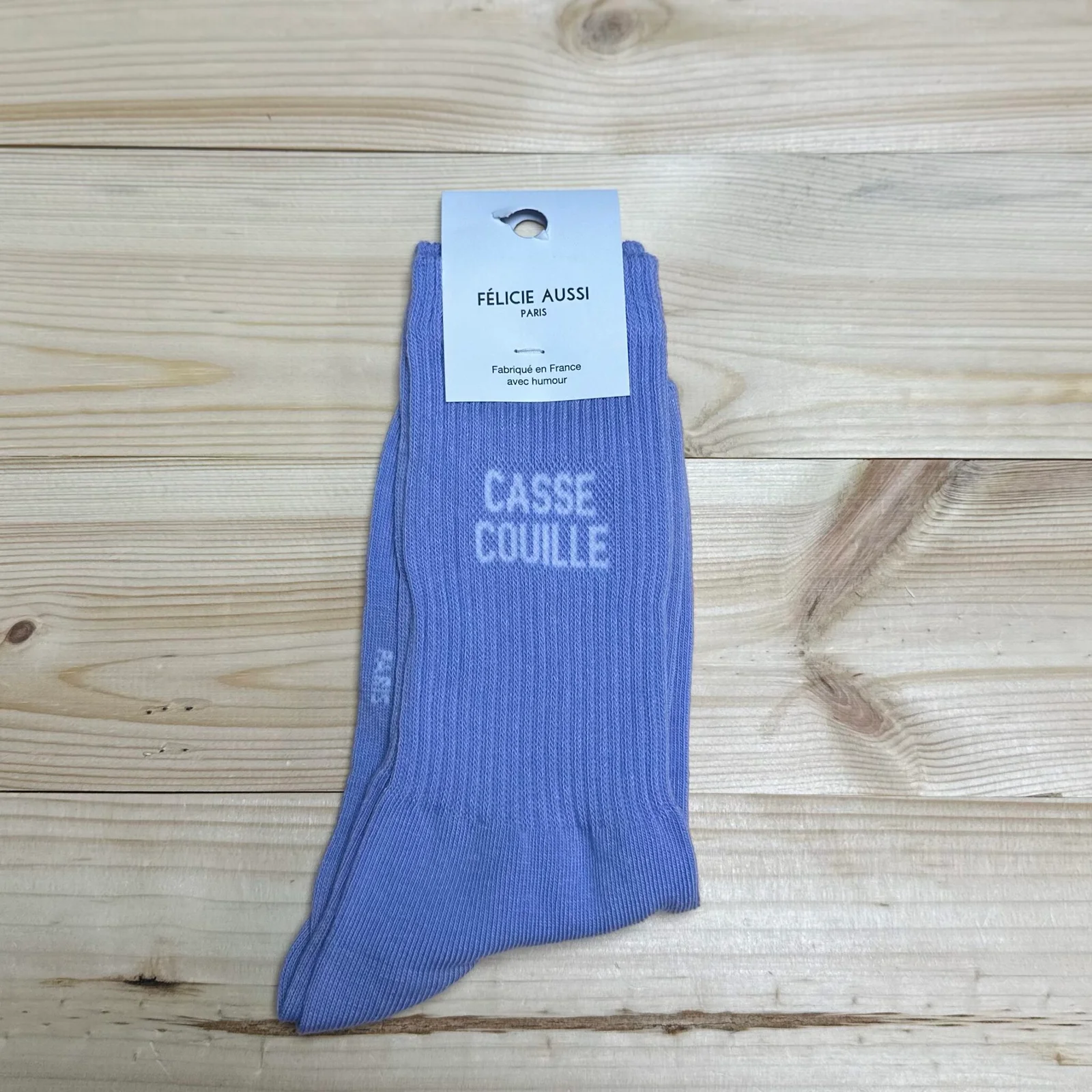 Chaussettes Mauves CASSE COUILLE, Félicie Aussi. Chaussettes pour ne pas se prendre au sérieux et rire de tout (surtout de soi-même!!). Merveilleuses avec les claquettes :-)) . Taille 36-40.