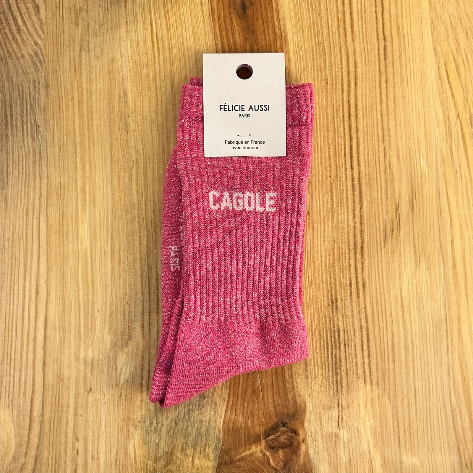 Les Chaussettes Paillettes Rose « Cagole », Félicie Aussi sont également une excellente idée cadeau. Elles surprennent par leur design original et laissent un sourire à celui qui les reçoit. Avec Félicie Aussi, chaque détail, même le plus quotidien, devient un clin d’œil stylé et amusant. Laissez-vous tenter par cette paire qui allie confort, humour et qualité et qui ajoute une touche pétillante à vos journées.