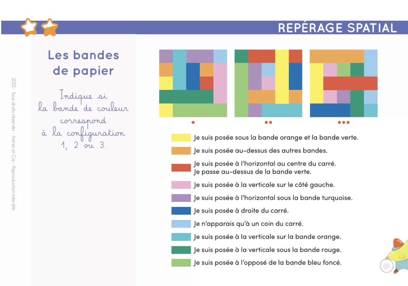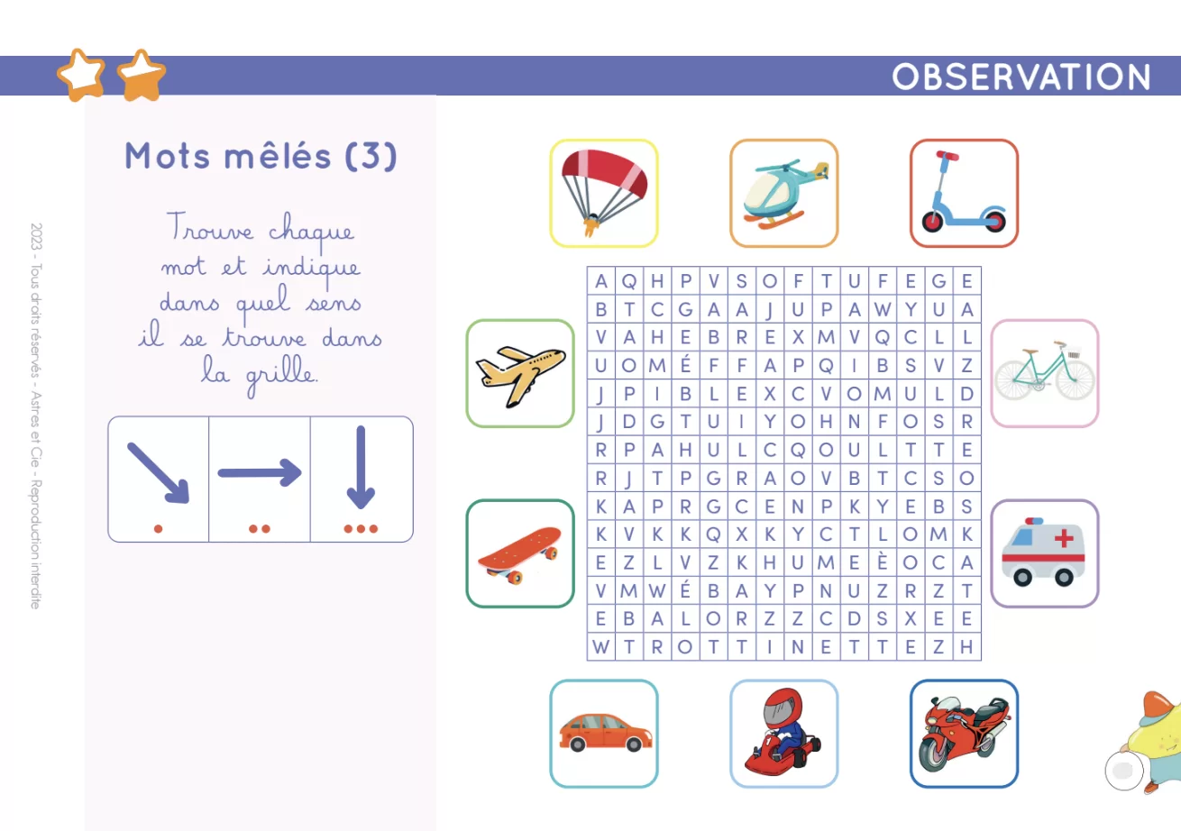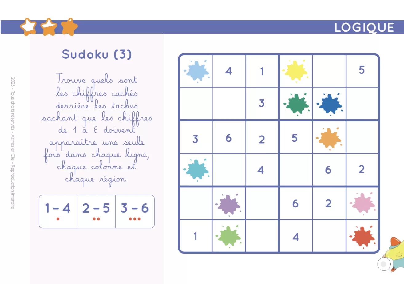 Élaboré par une enseignante spécialisée, ce chevalet contient 100 fiches variées qui abordent des thèmes essentiels au développement cognitif : repérage spatial, association, raisonnement, observation, casse-têtes visuels, et plus encore. Chaque fiche propose 10 questions, autocorrectives avec l’Etoilium (vendu séparément), et offre une récompense à gratter en cas de réussite totale !