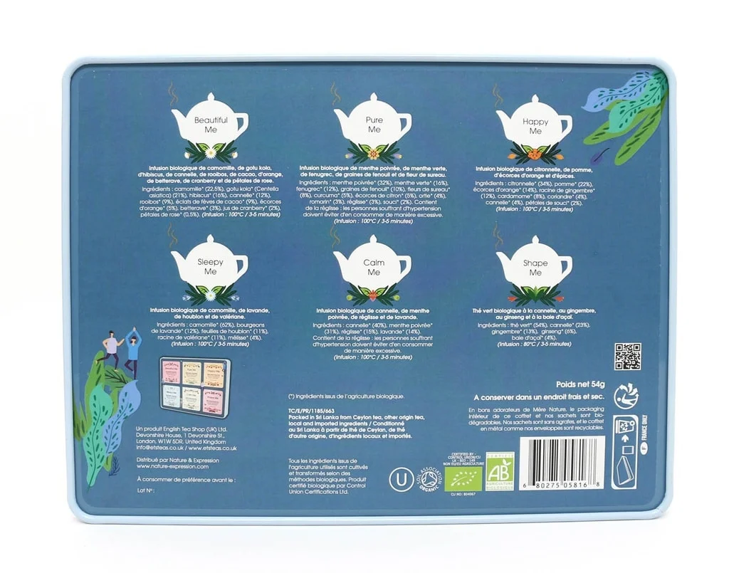 Coffret Bien Etre Bio English Tea, Nature et Expression. Une selection de thés et d’infusions biologiques doux et apaisants dans un superbe coffret métallique. Un assortiment de 6 mélanges concus avec votre bien-être à l’esprit, associant les bénéfices naturels d’herbes et de fruits soigneusement séléctionnés.