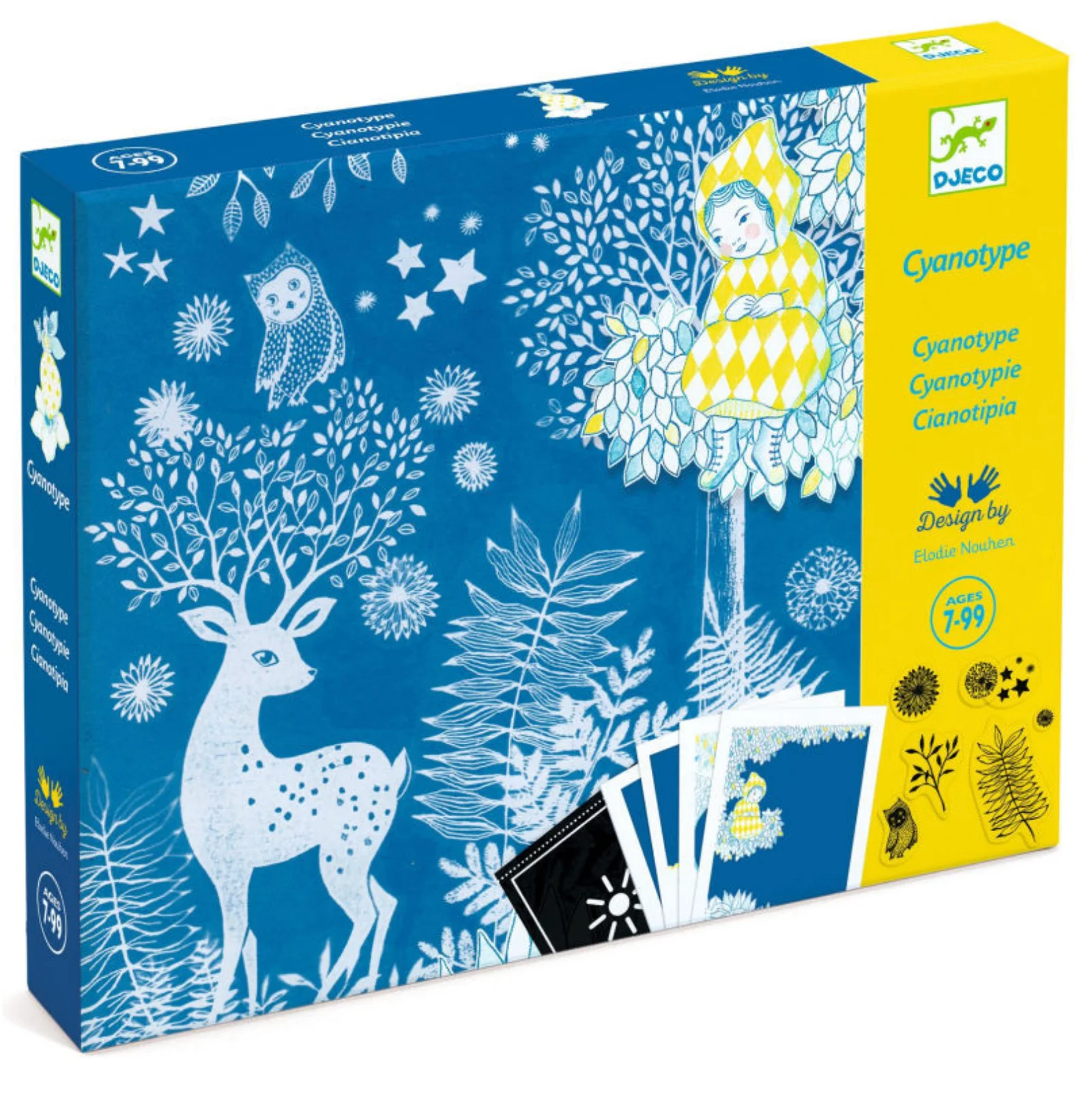 Coffret cyanotype « Au clair de la lune », Djeco Le coffret Cyanotype « Au clair de la lune » de Djeco permet aux enfants de découvrir l’art ancien de la photographie à travers la technique du cyanotype. Créez de magnifiques impressions en utilisant des objets naturels et de la lumière du soleil.