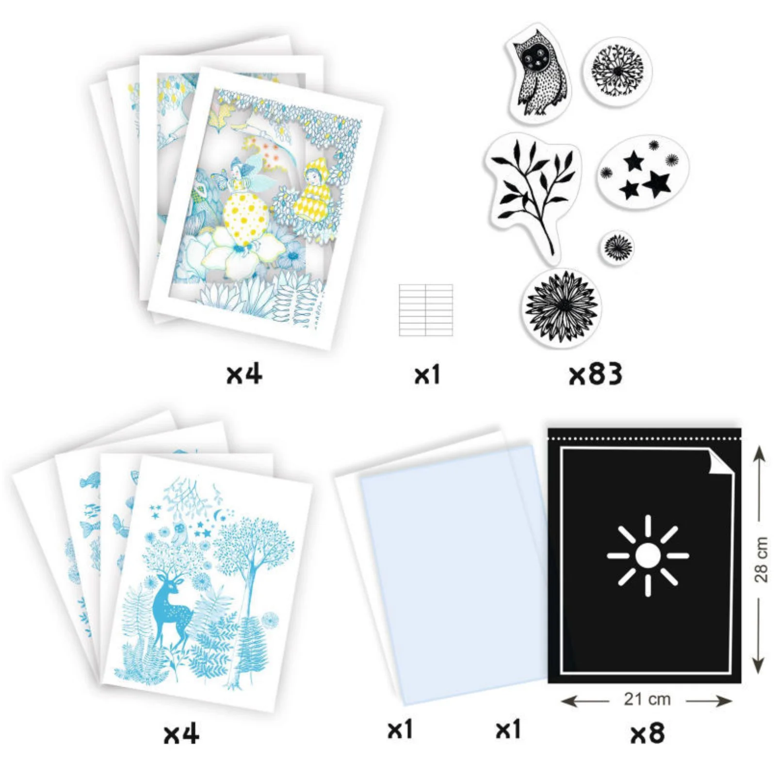 - Contenu du coffret : 4 cadres illustrés avec découpe au laser (21 X 28 cm), 8 feuilles de papier photosensible (21 x 28 cm), 83 motifs imprimés sur rhodoïd, 1 plaque de plexiglas, 1 planche d’adhésifs double-face et 1 livret explicatif pas à pas en couleur et uniquement en images.
